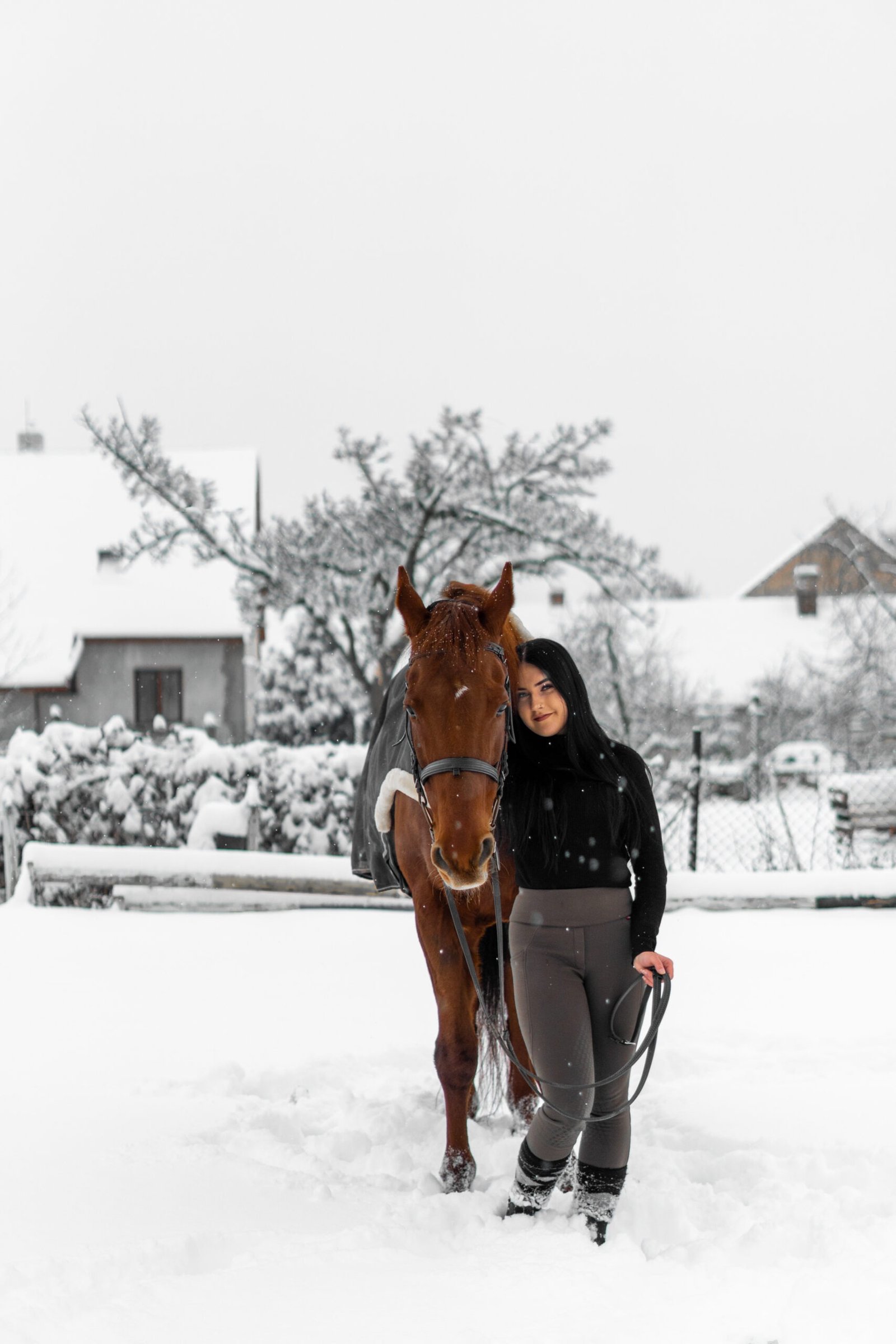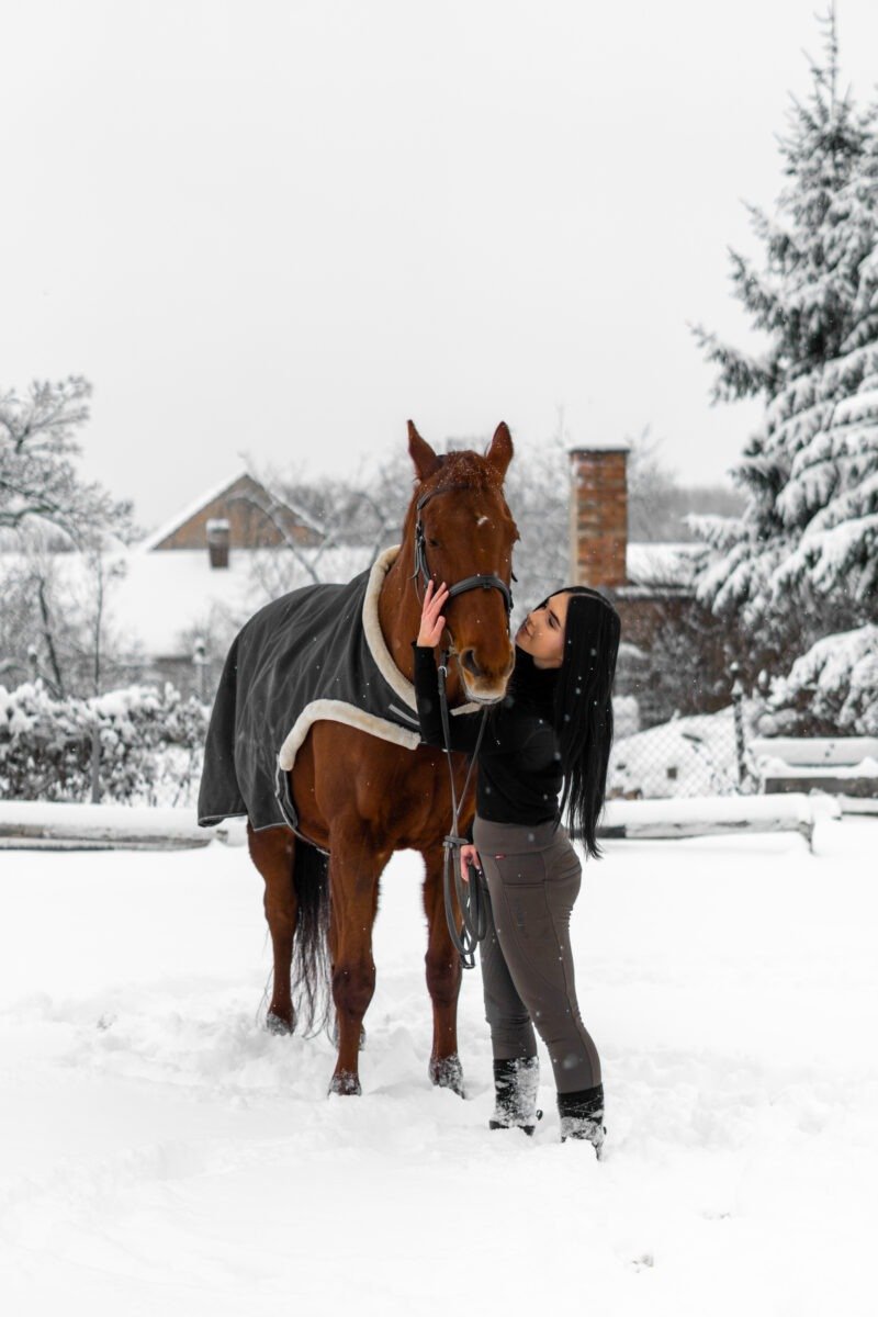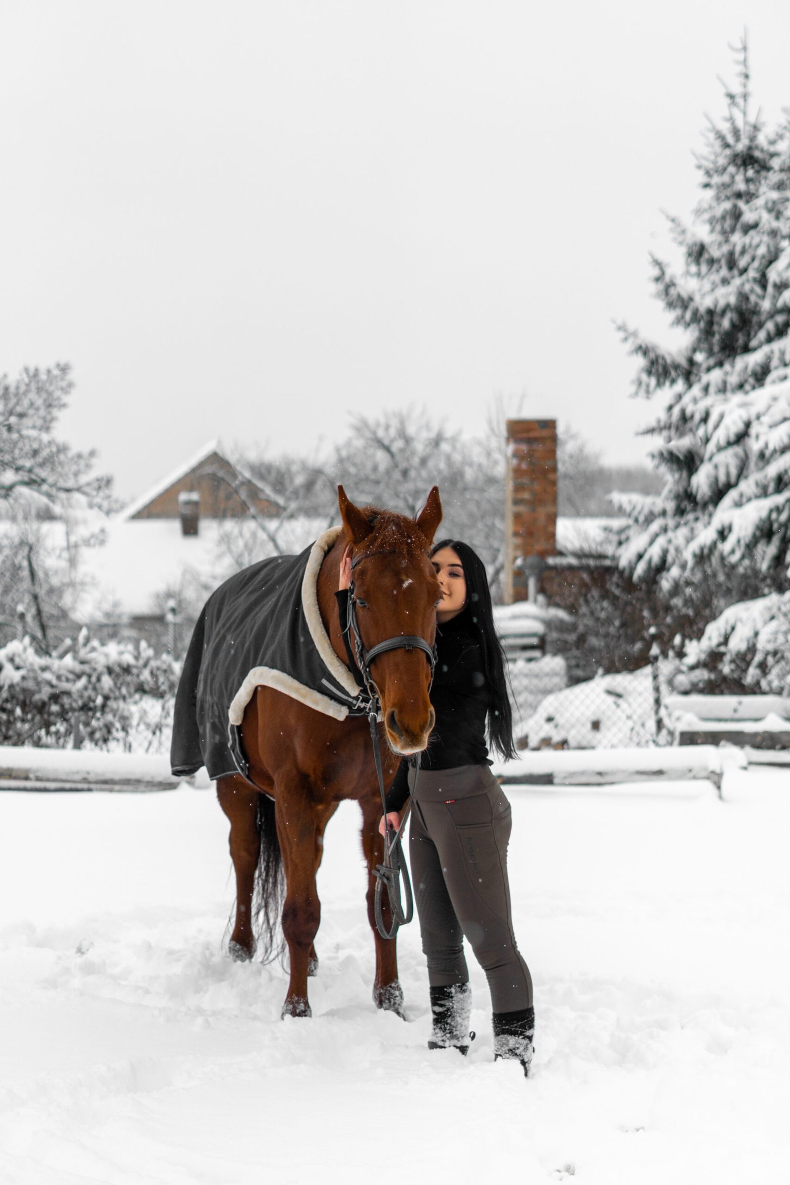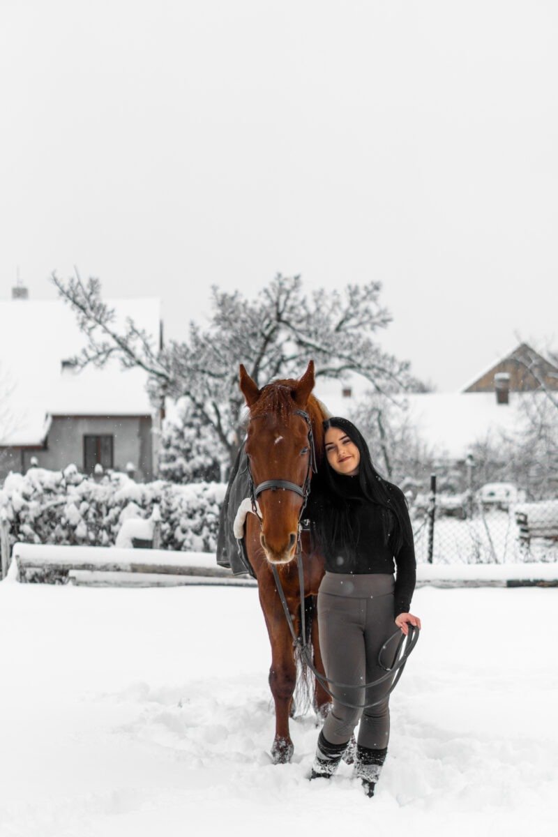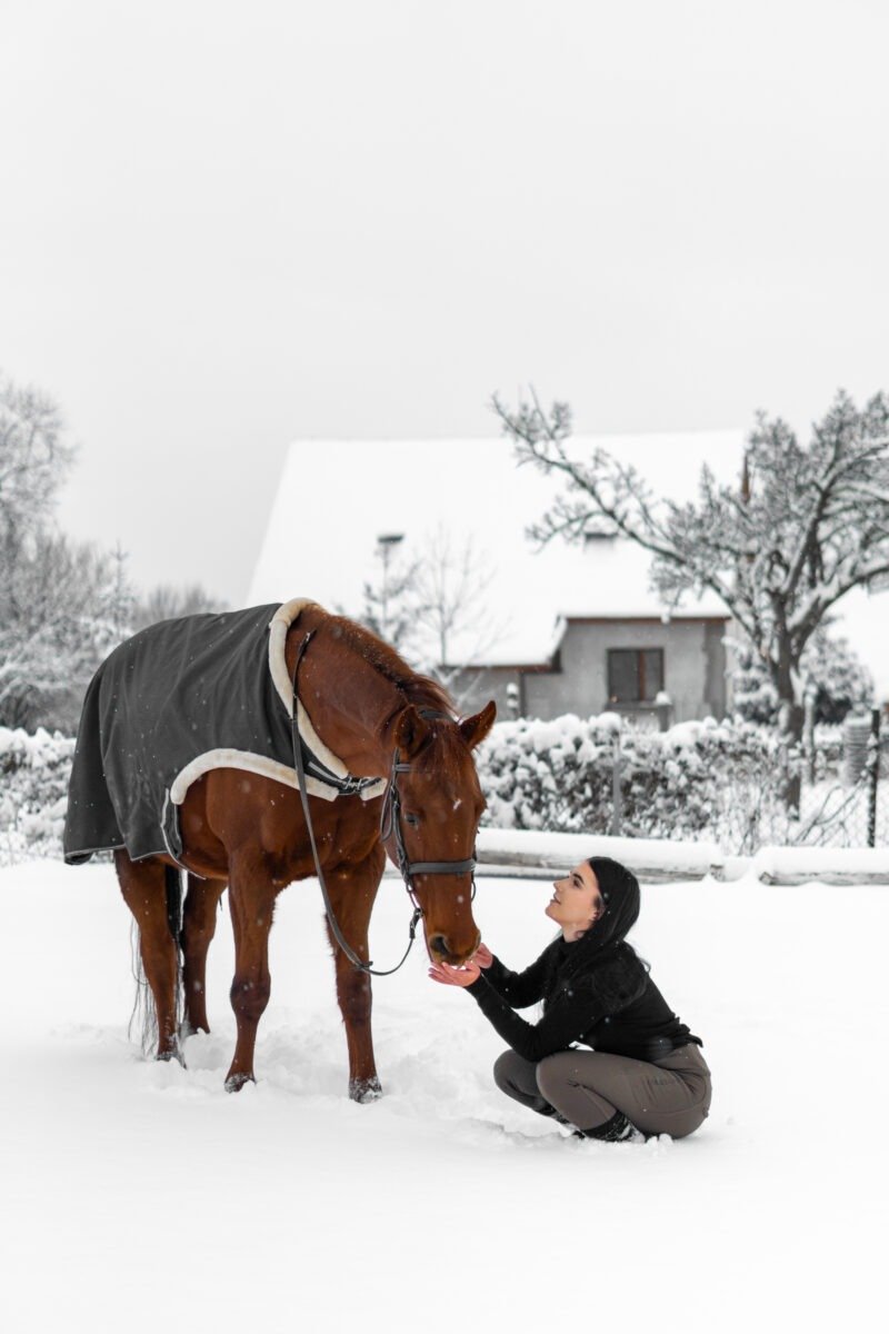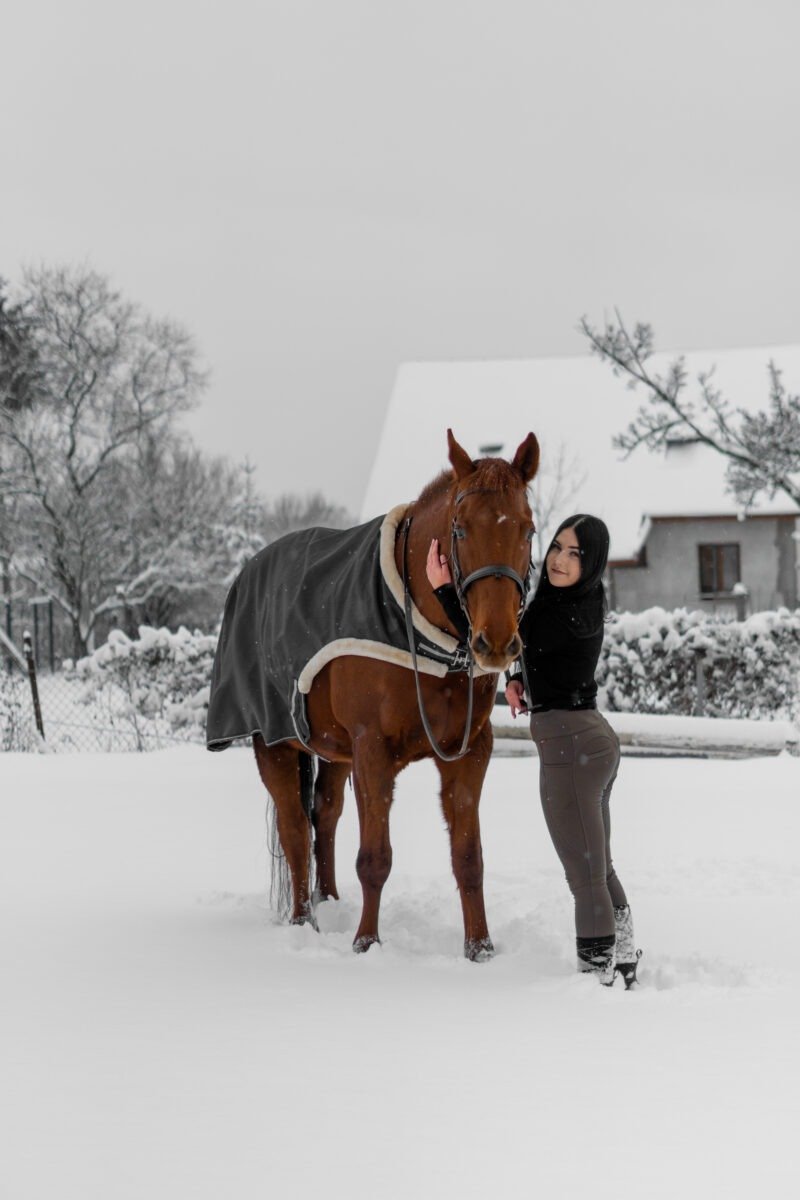 Zimní focení modelky ve společnosti koní
