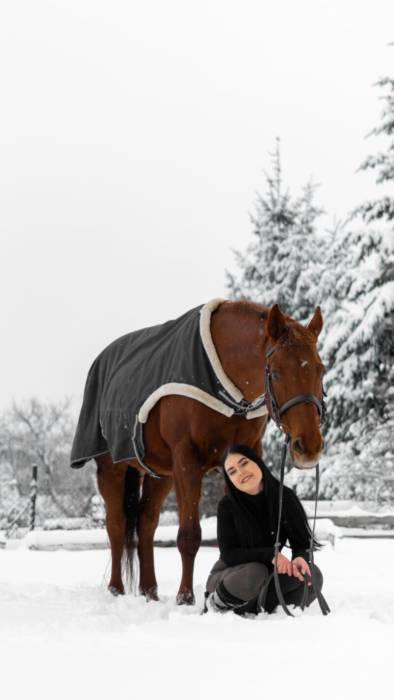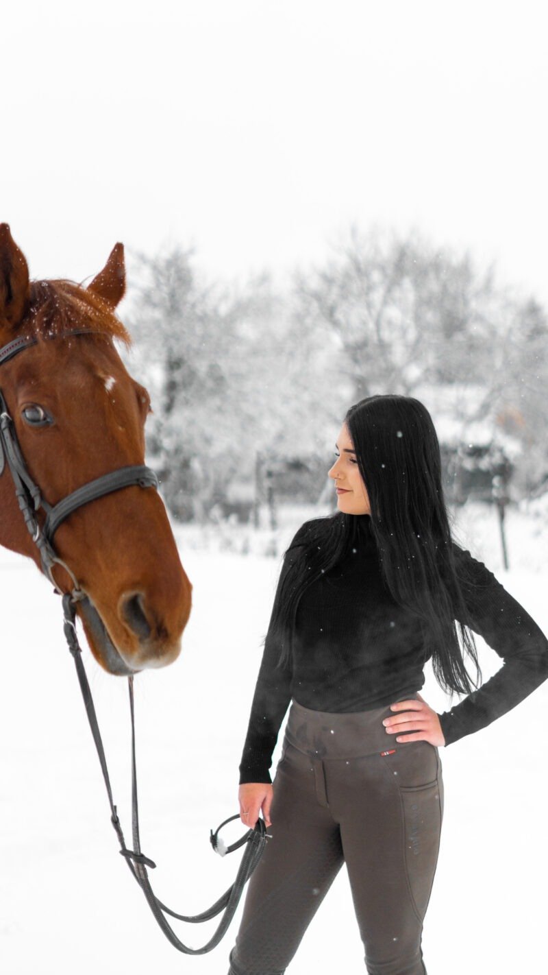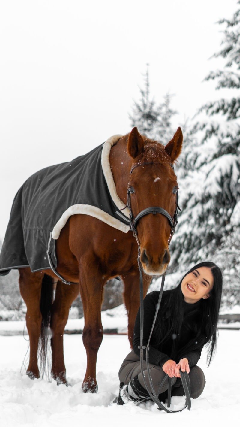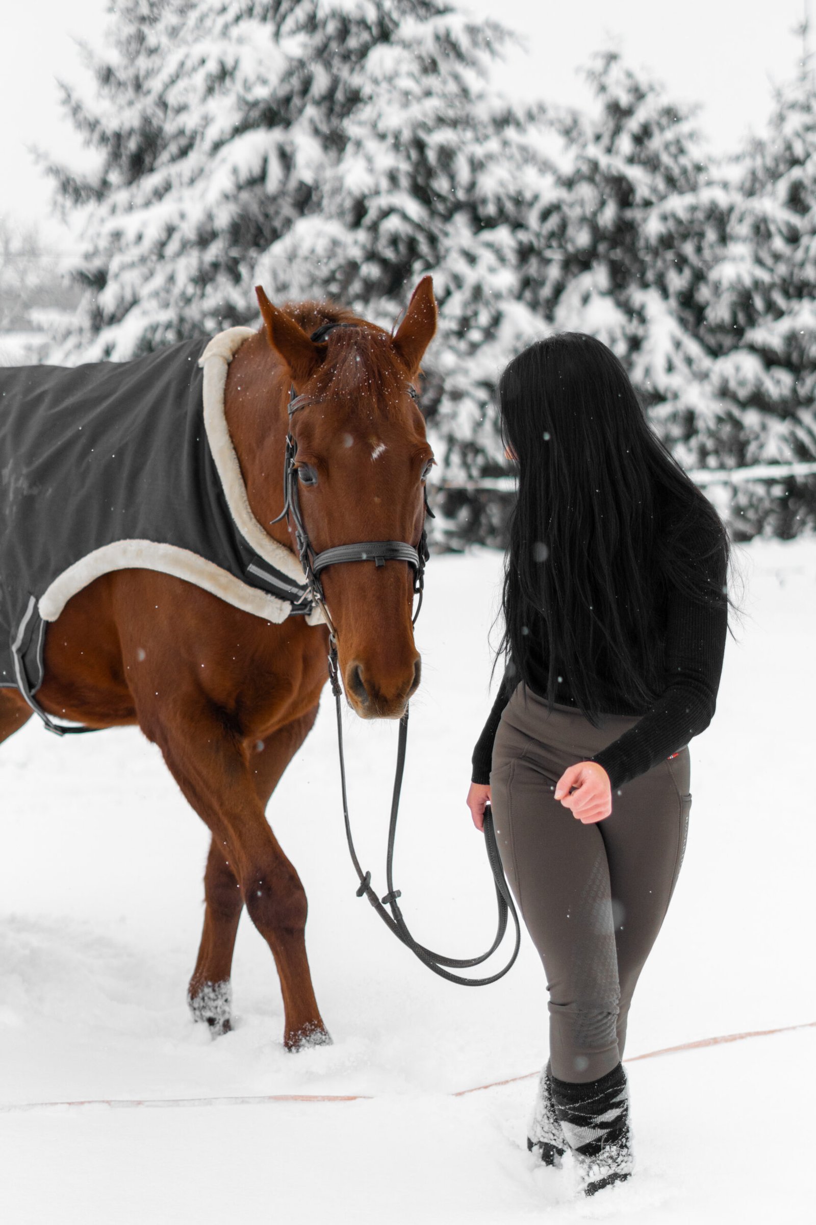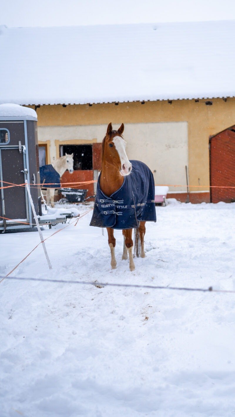 Zimní focení modelky ve společnosti koní