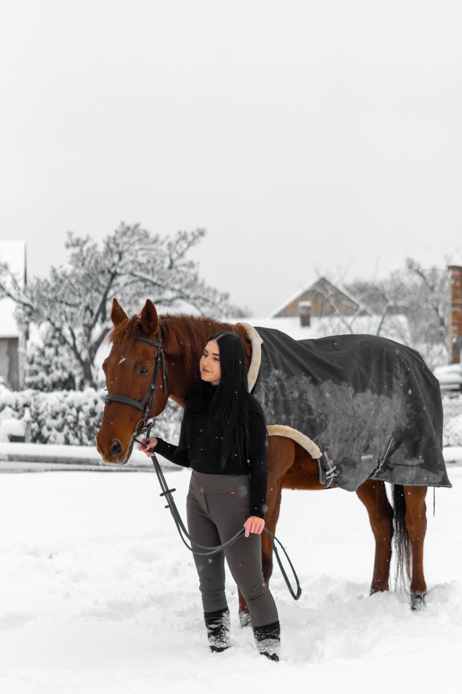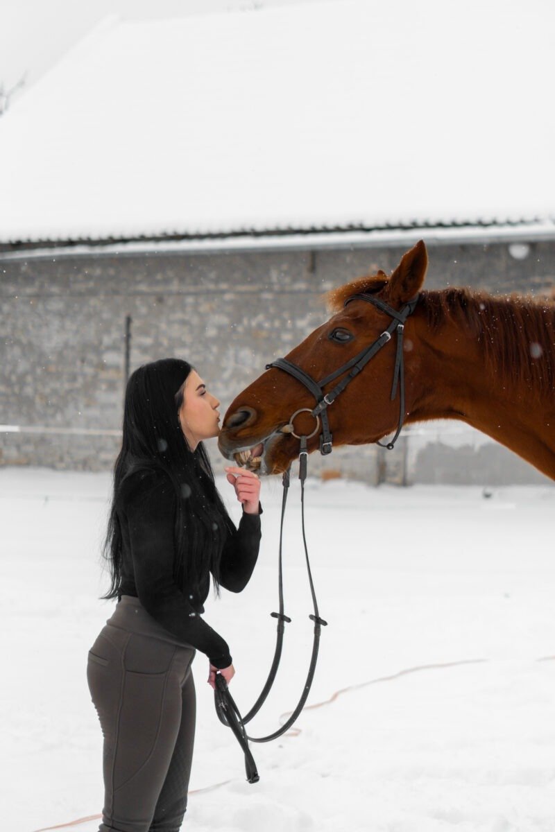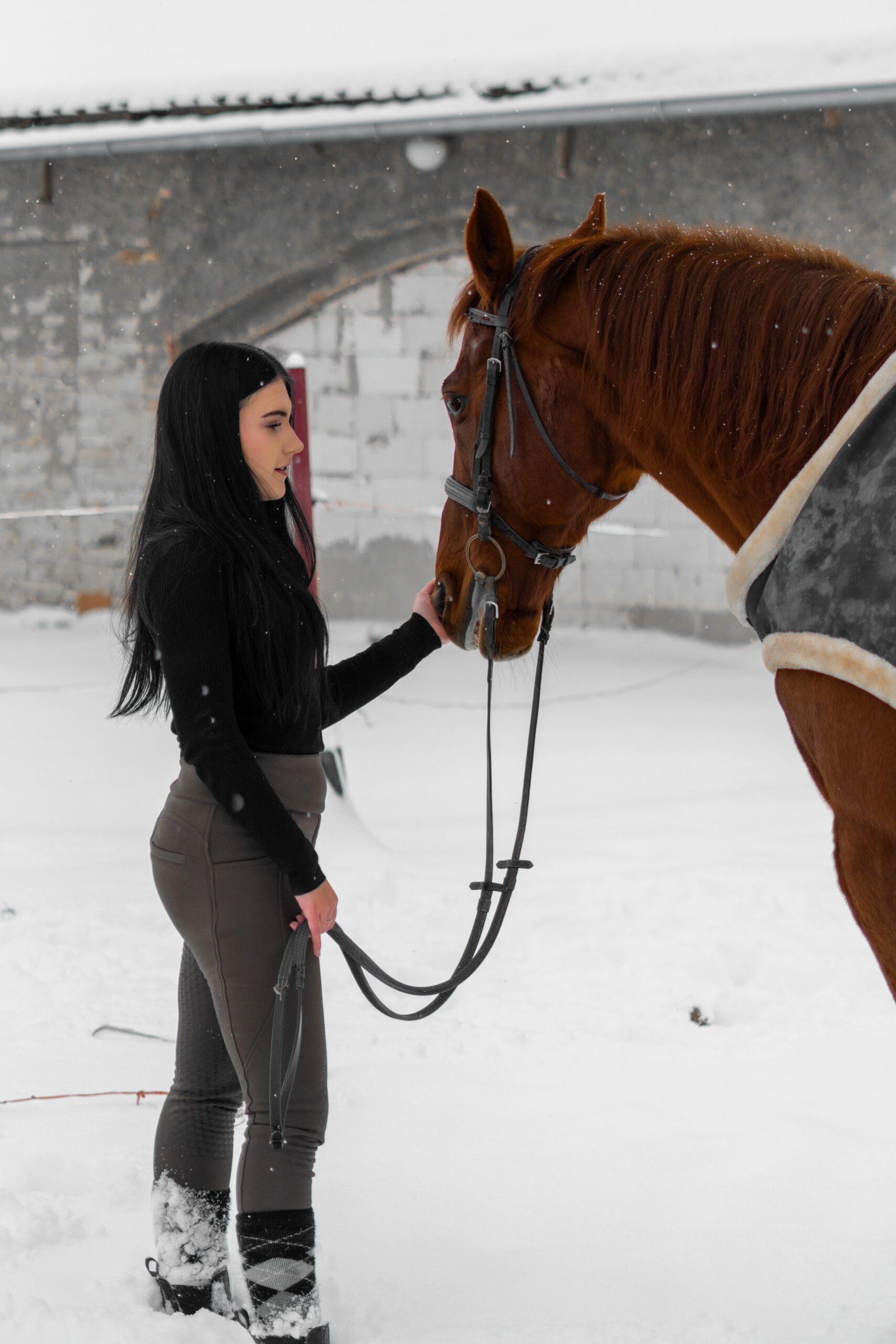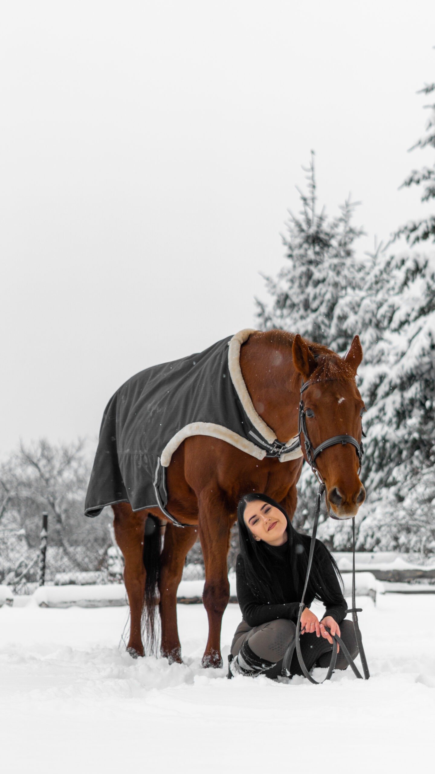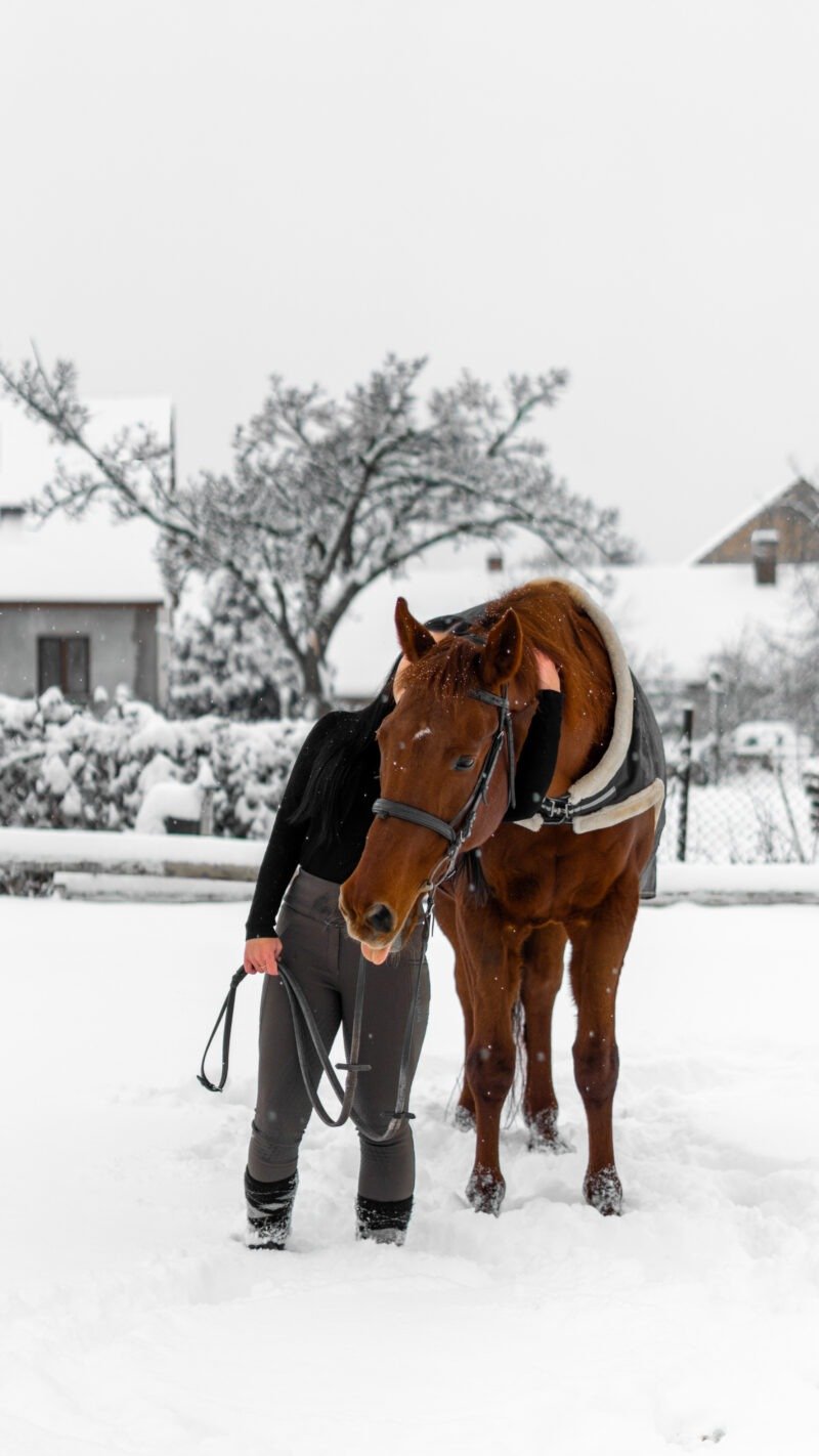 Zimní focení modelky ve společnosti koní
