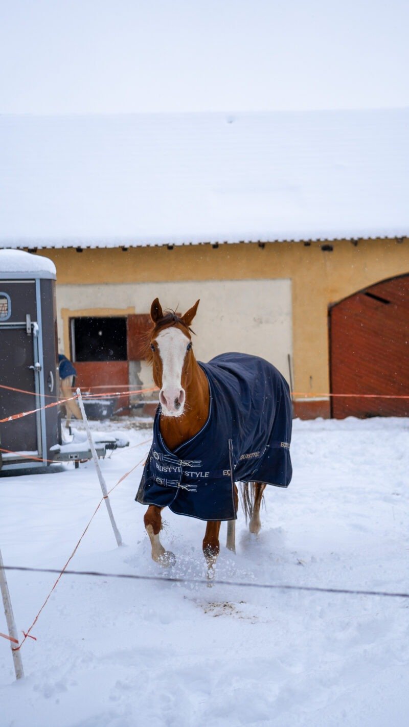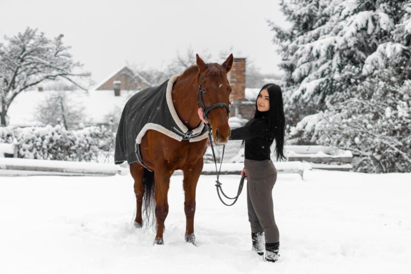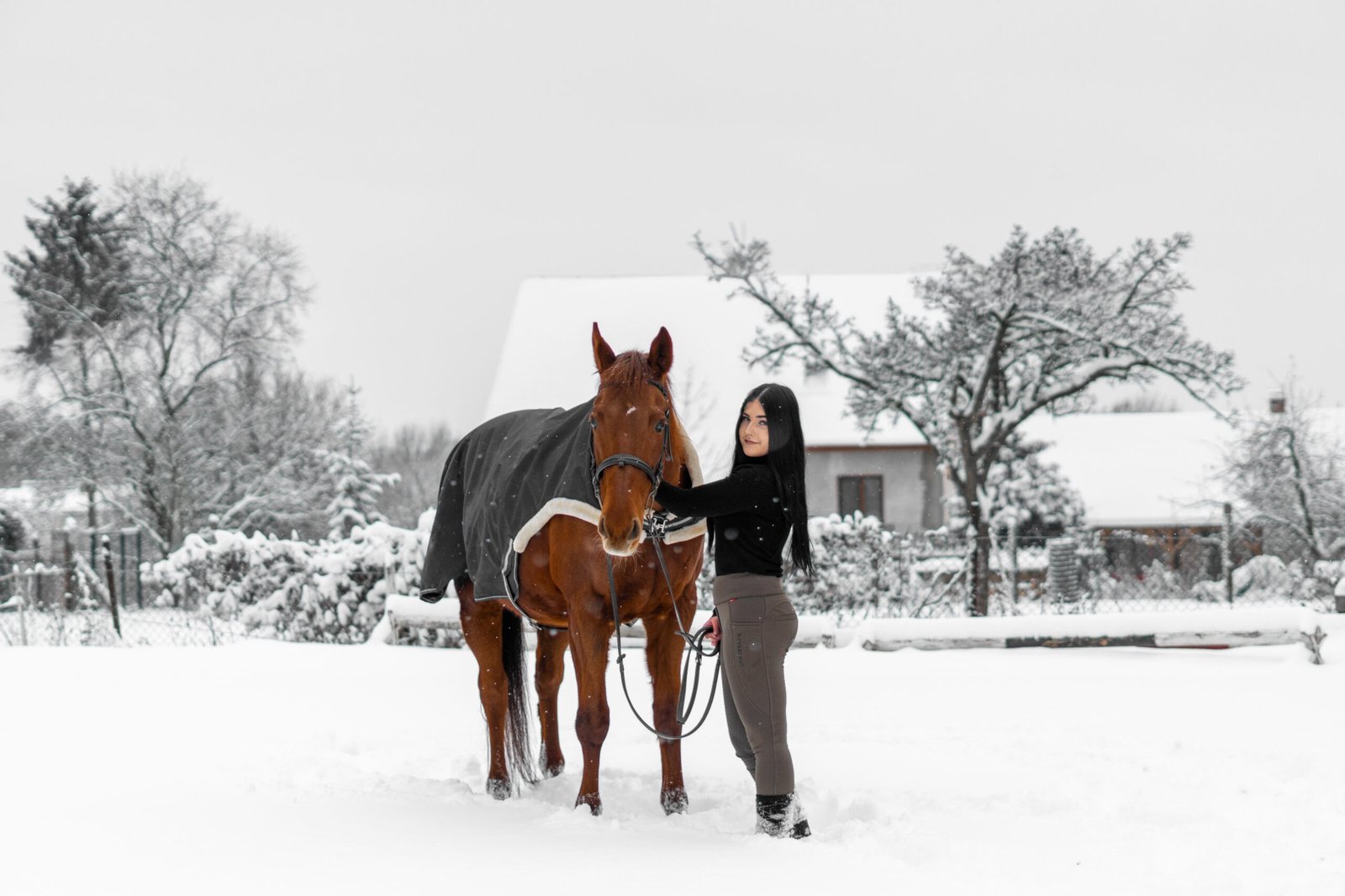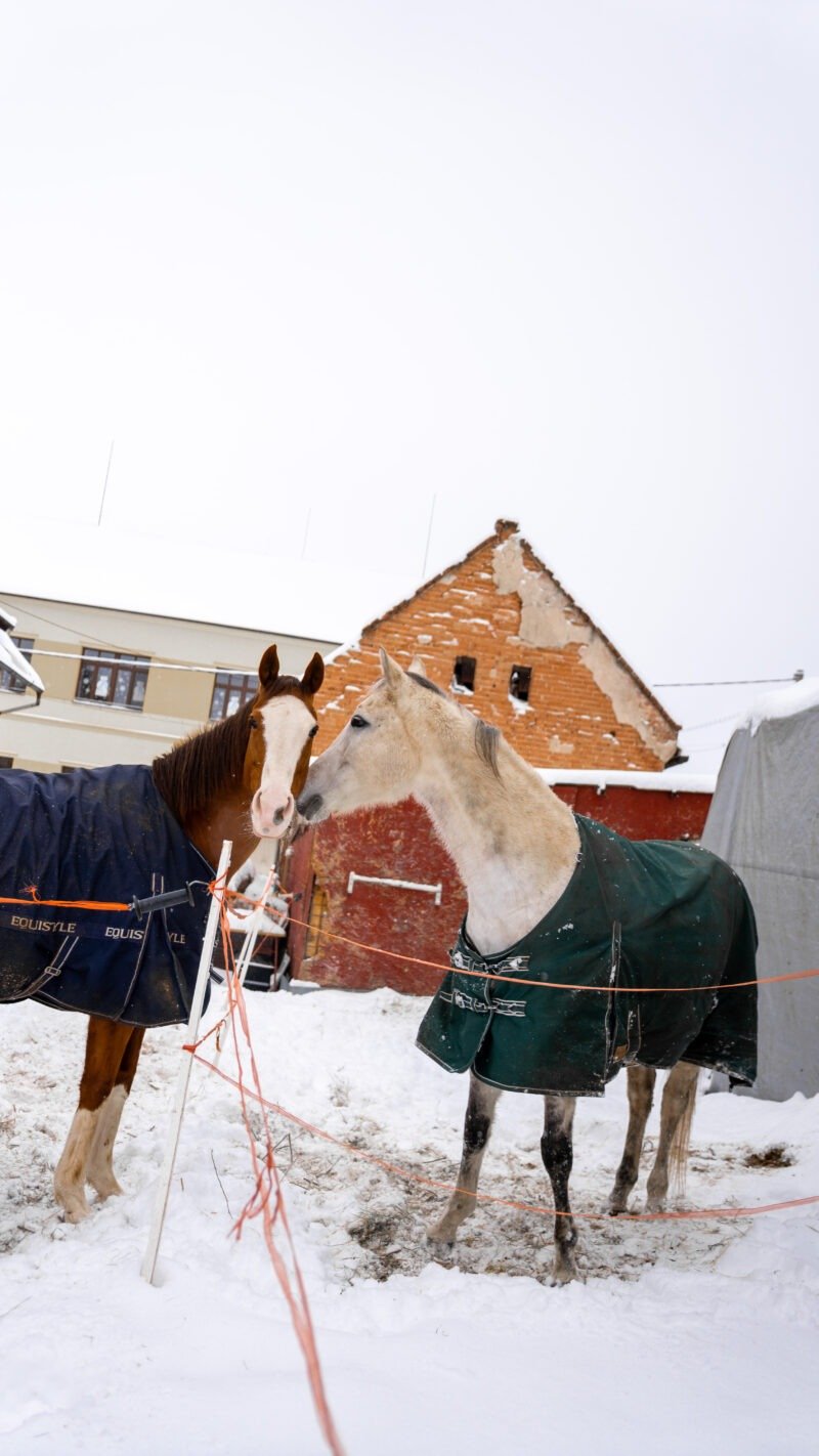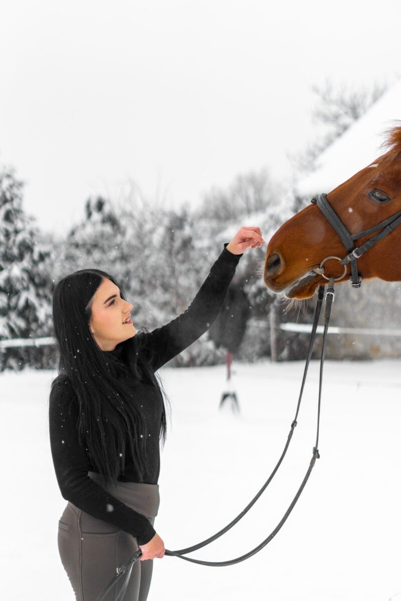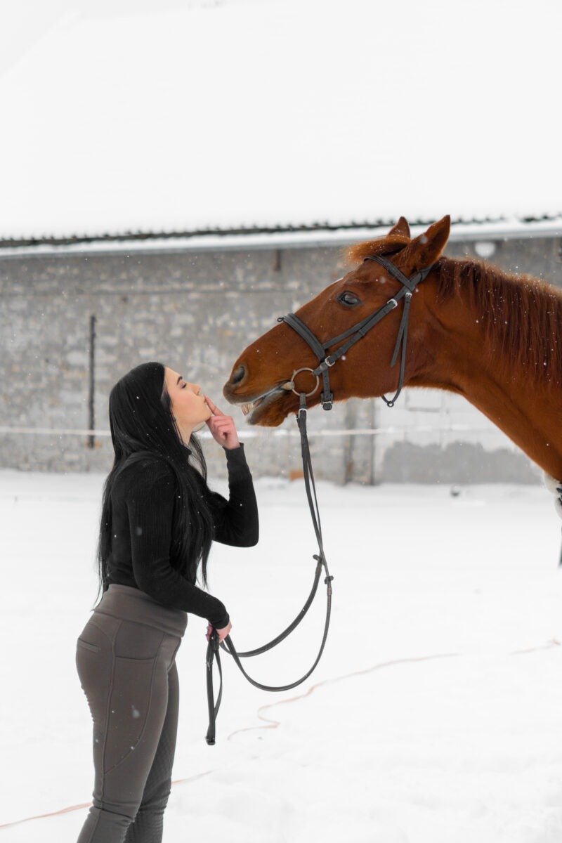 Zimní focení modelky ve společnosti koní