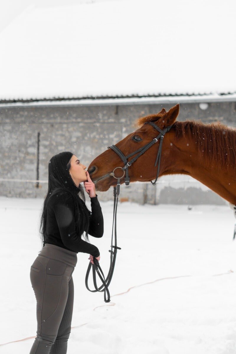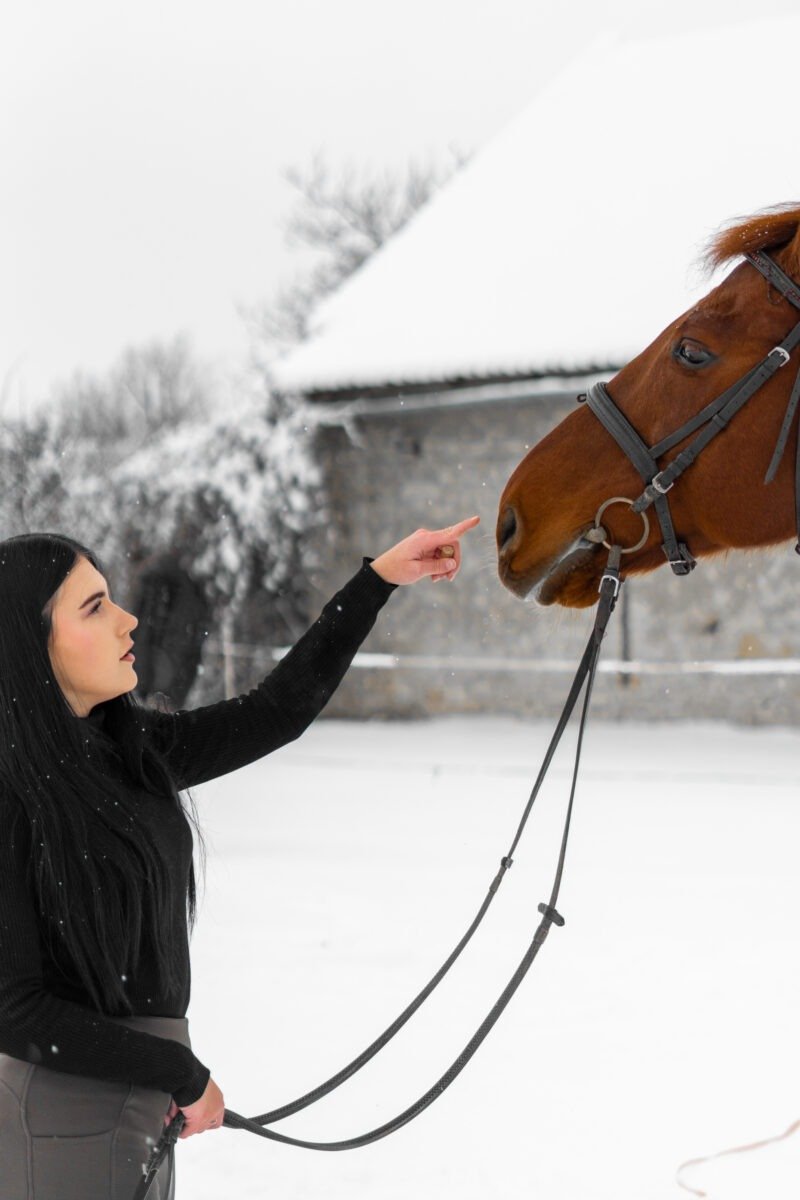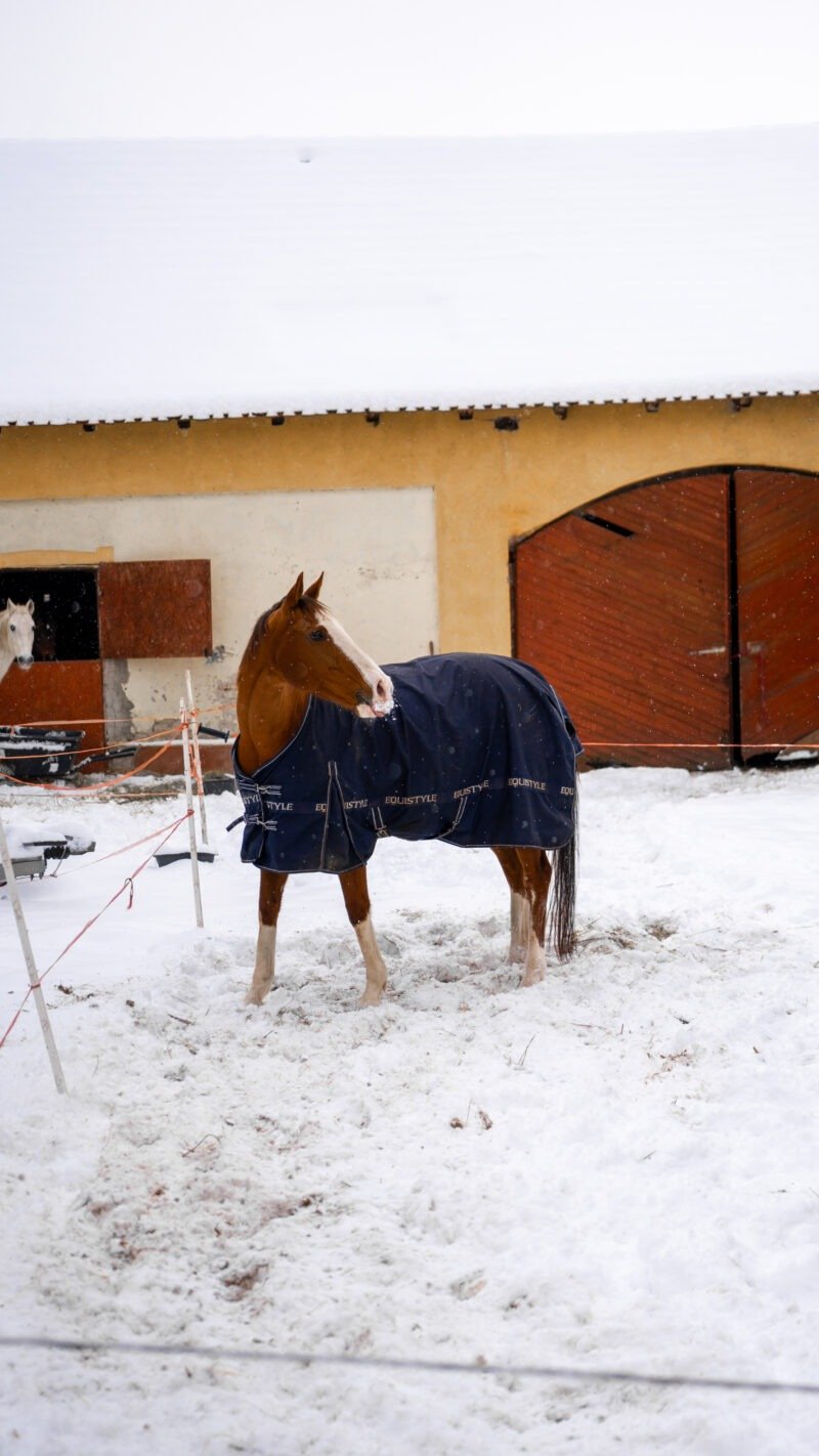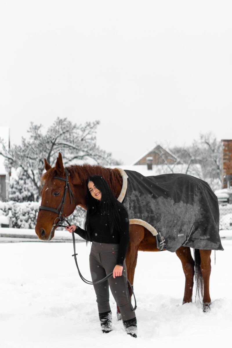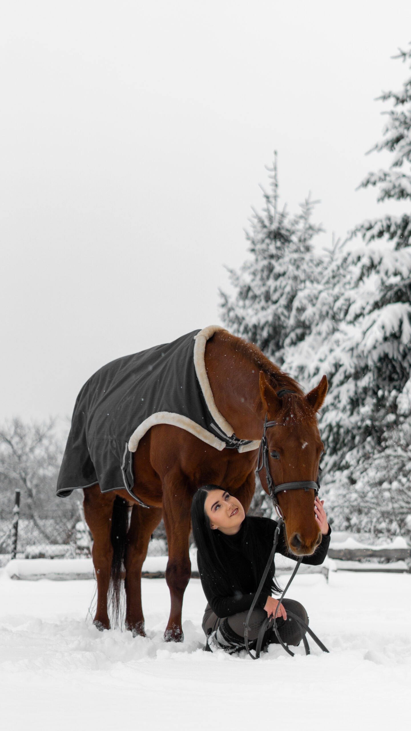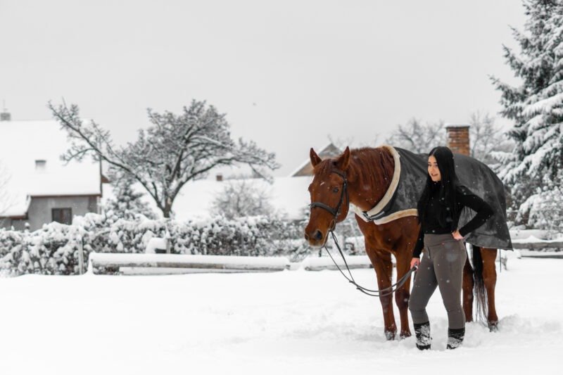 Zimní focení modelky ve společnosti koní