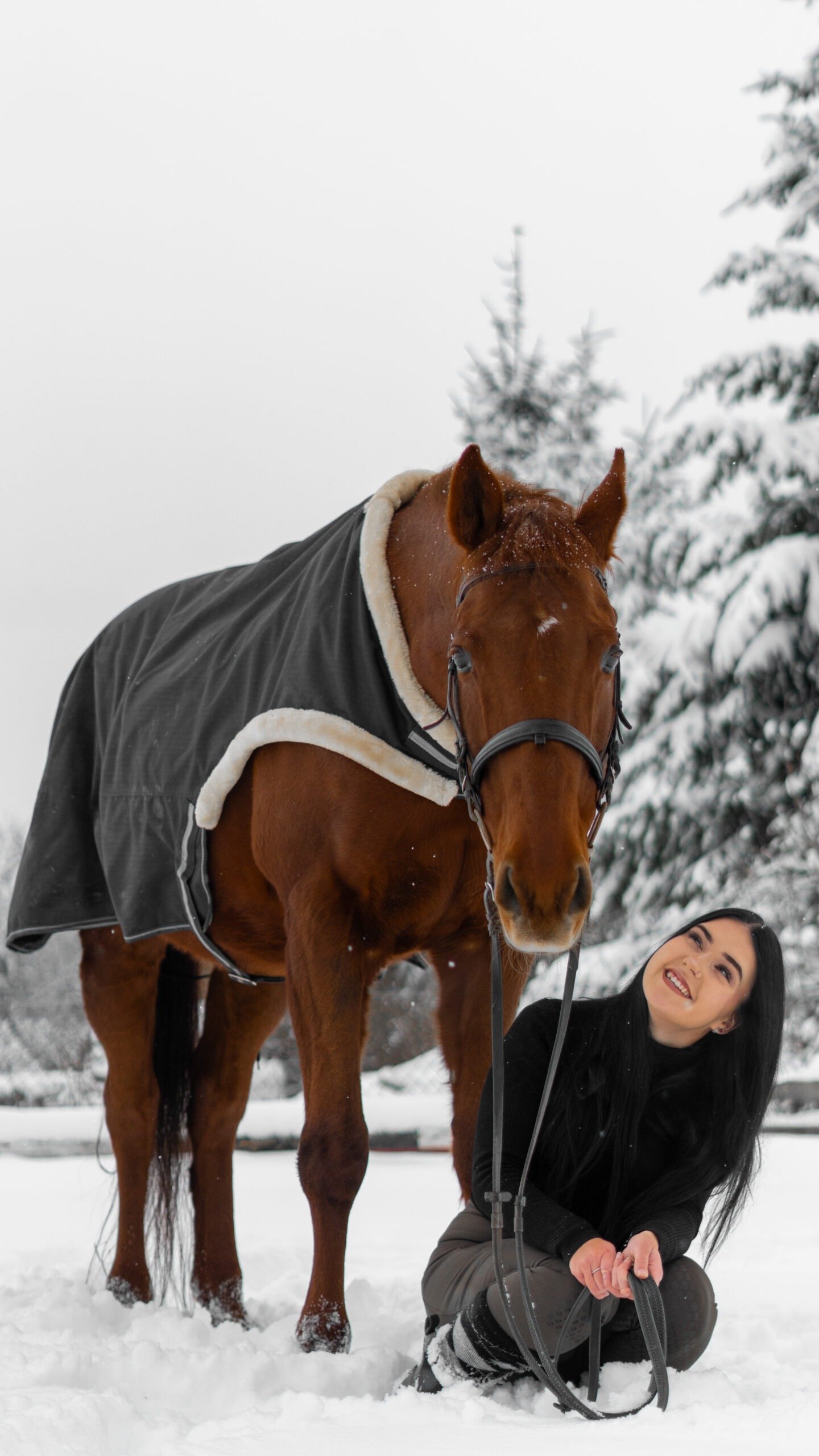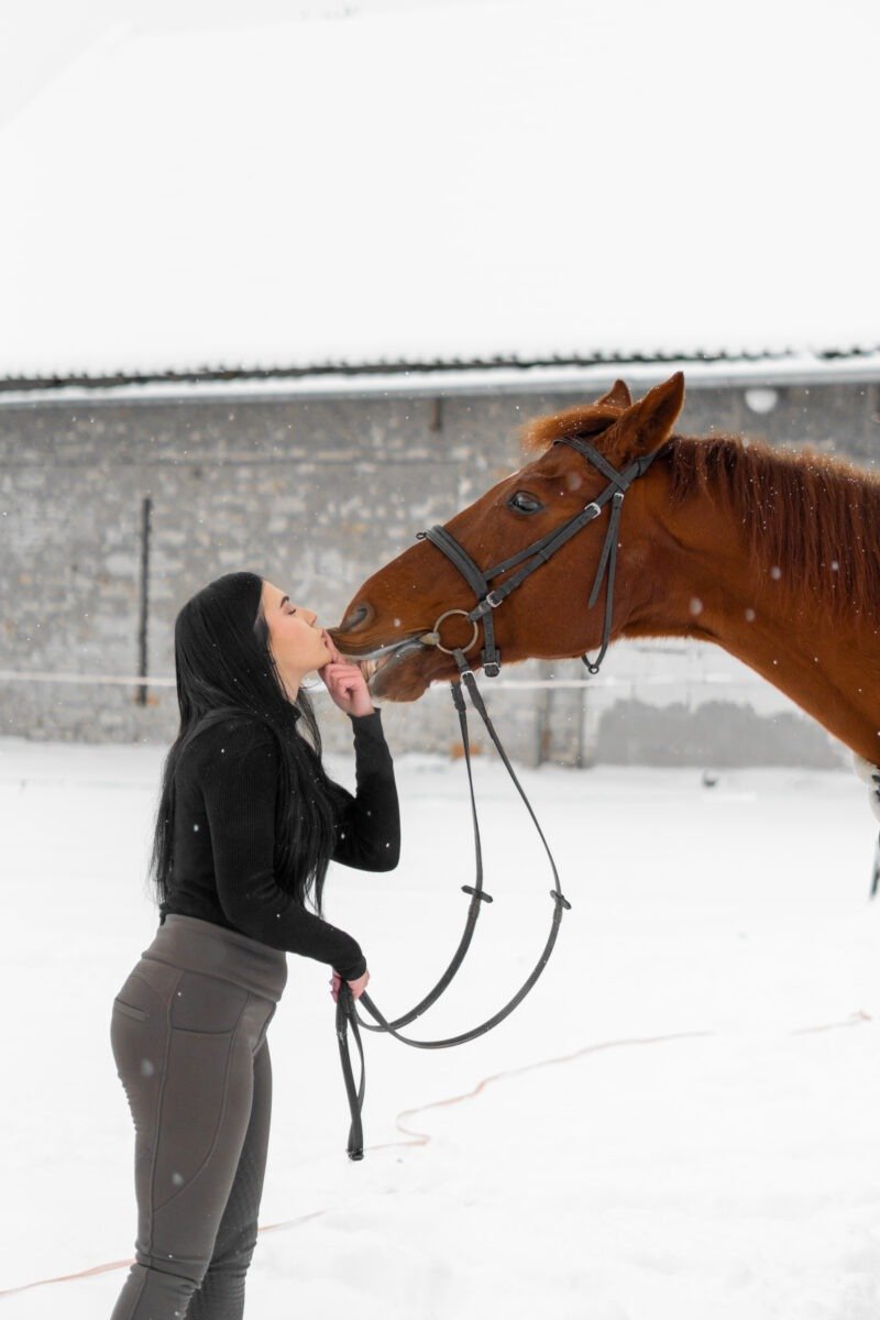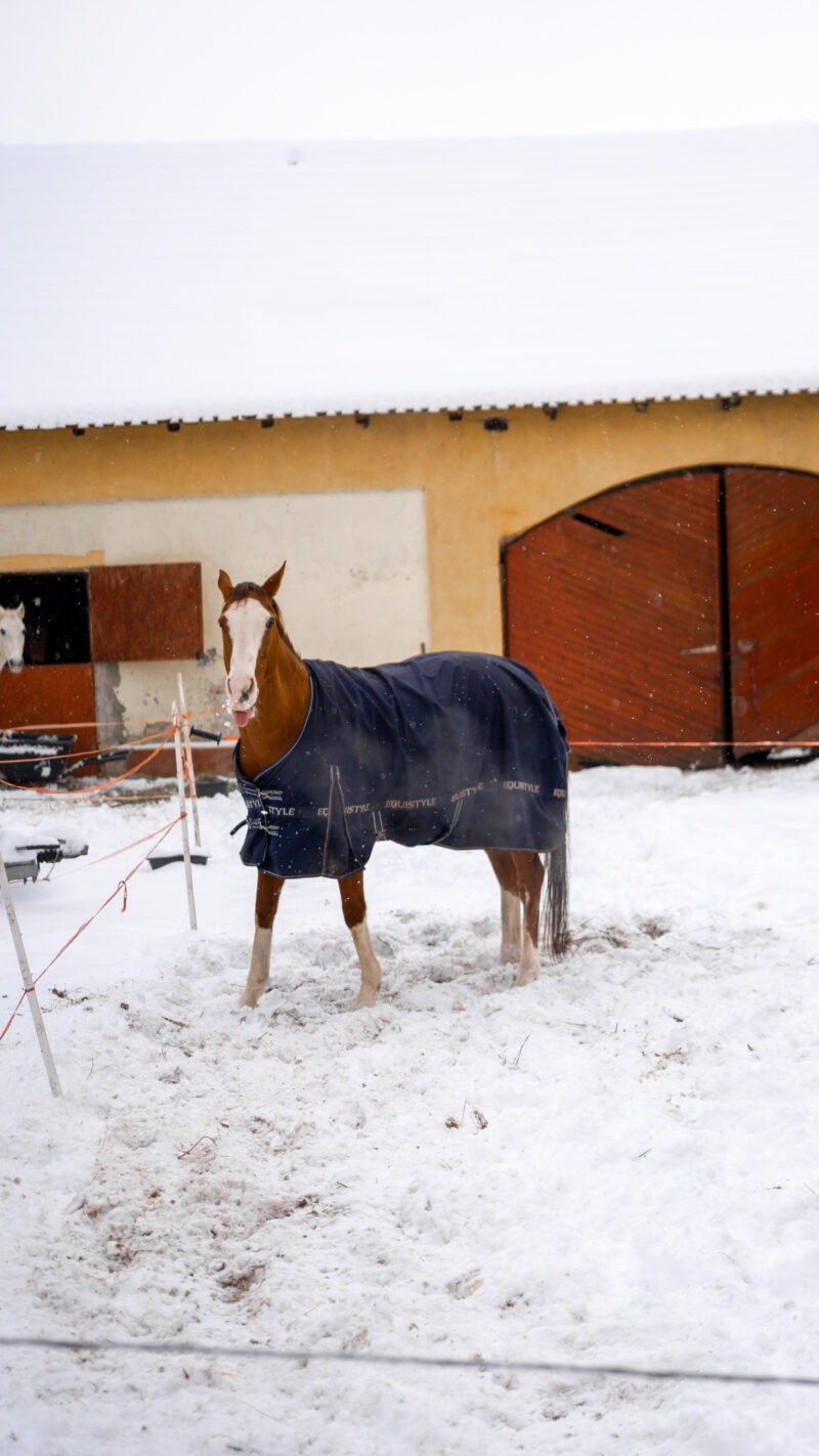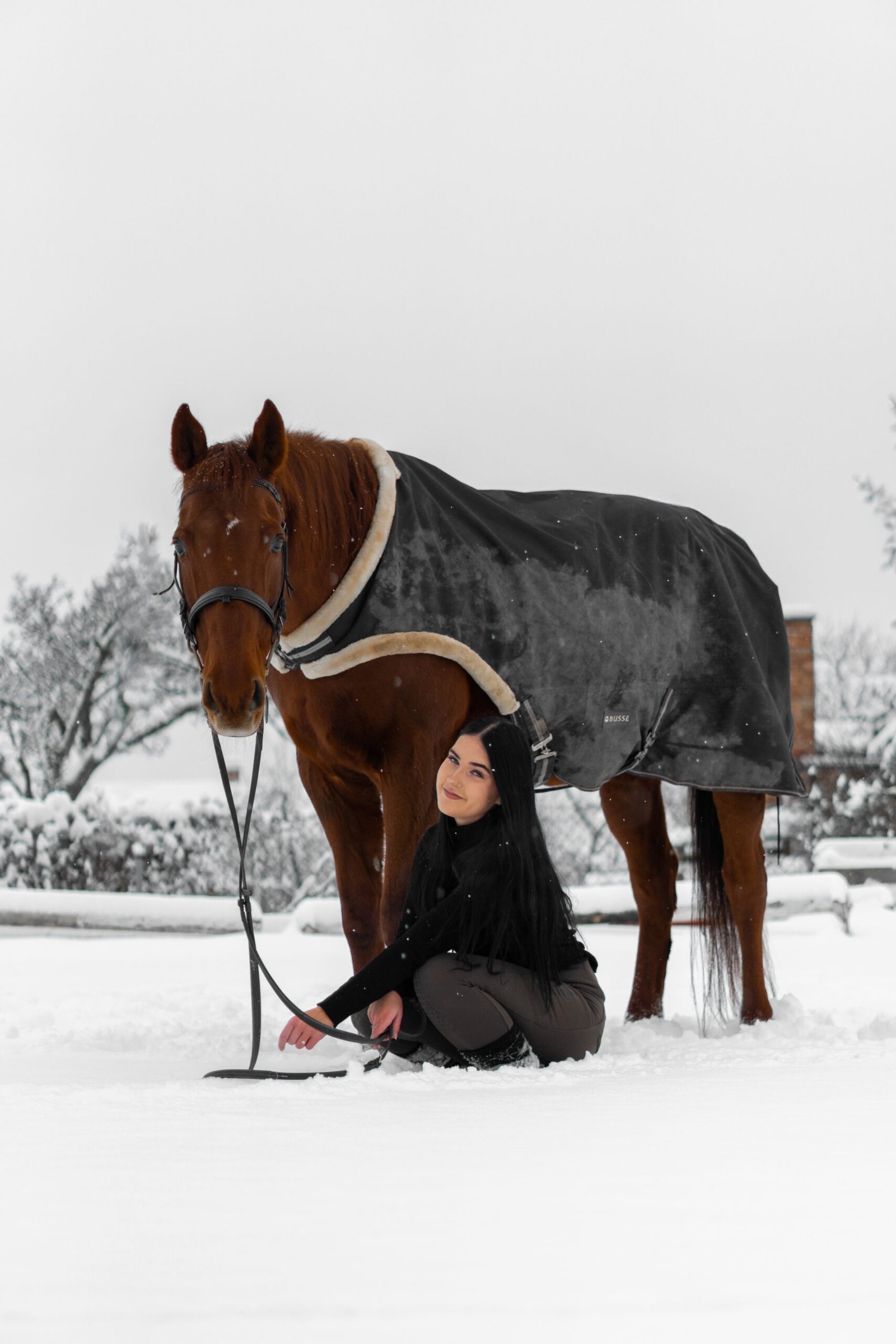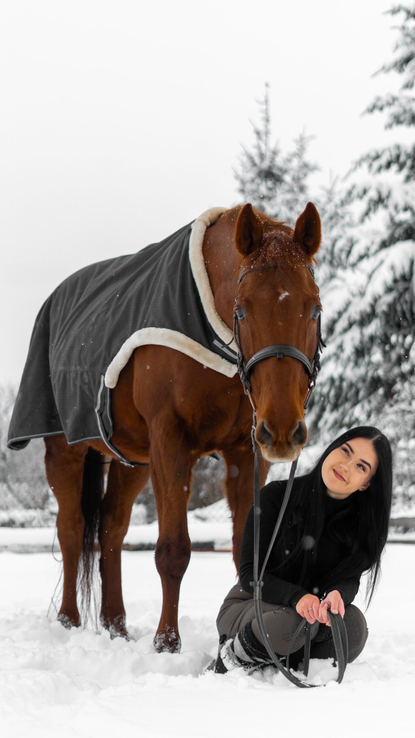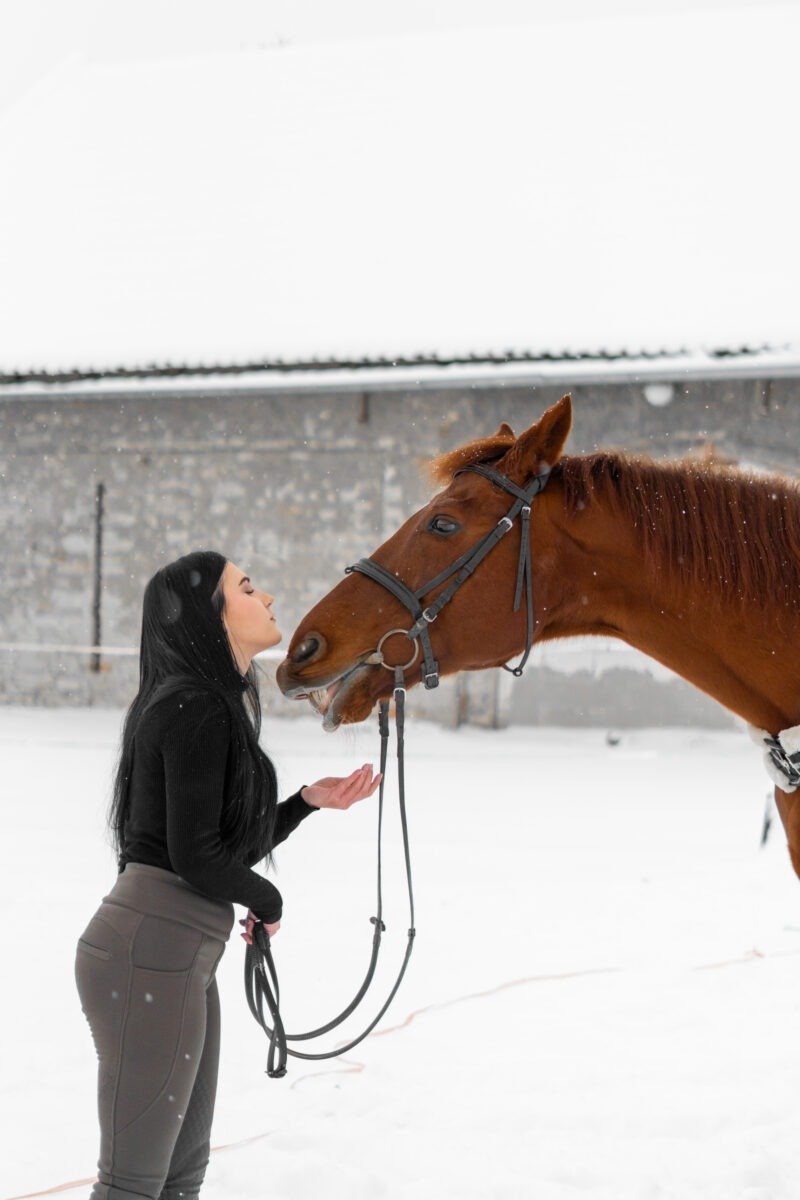 Zimní focení modelky ve společnosti koní