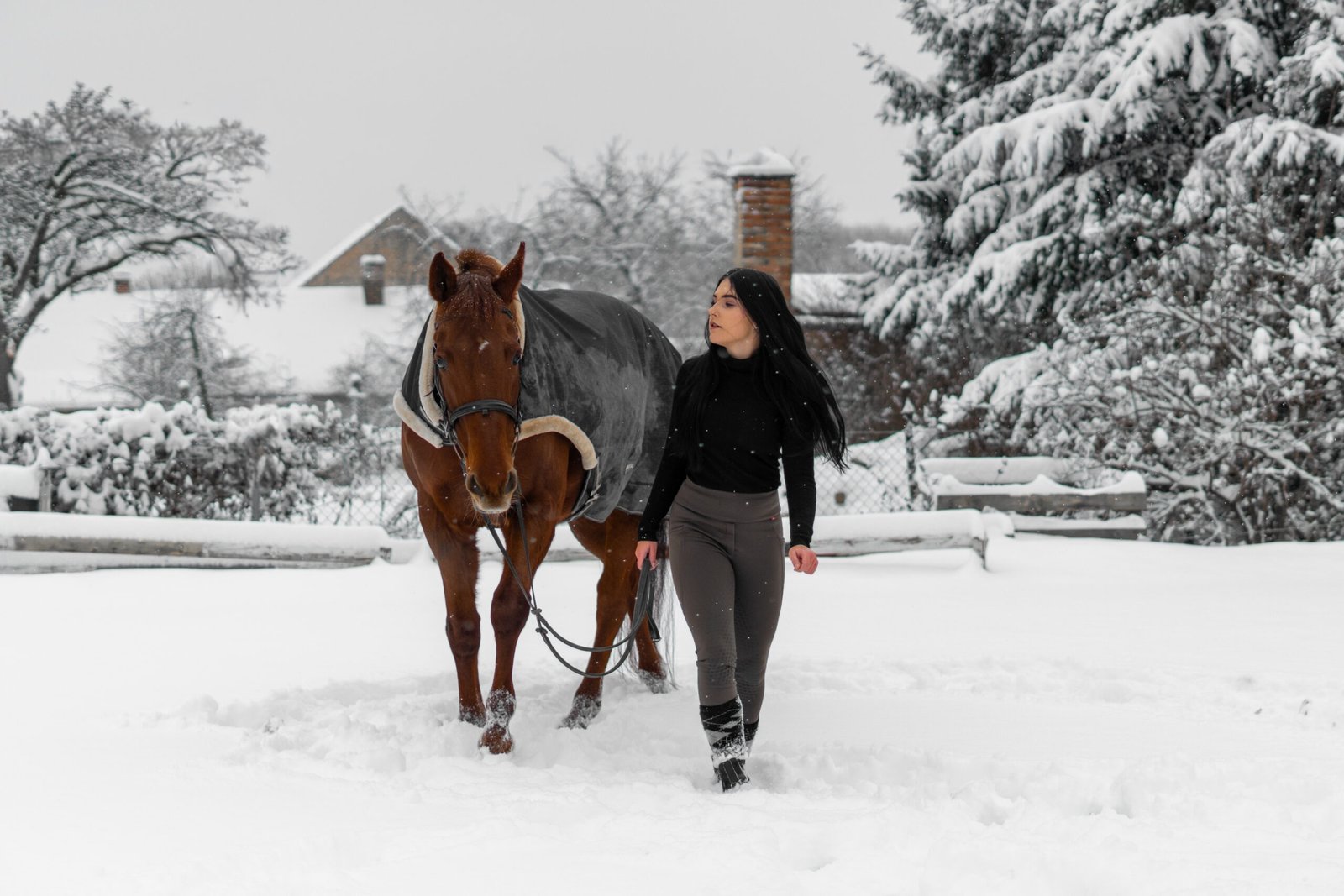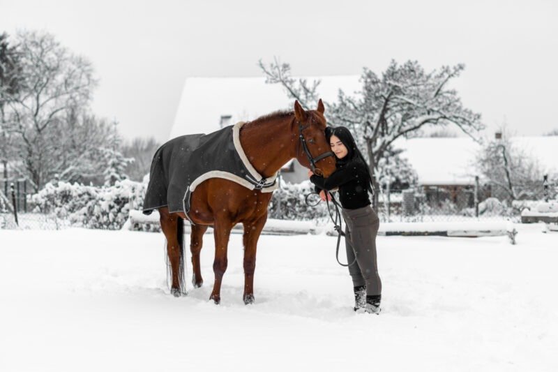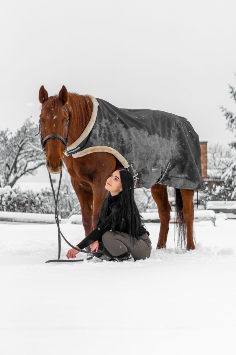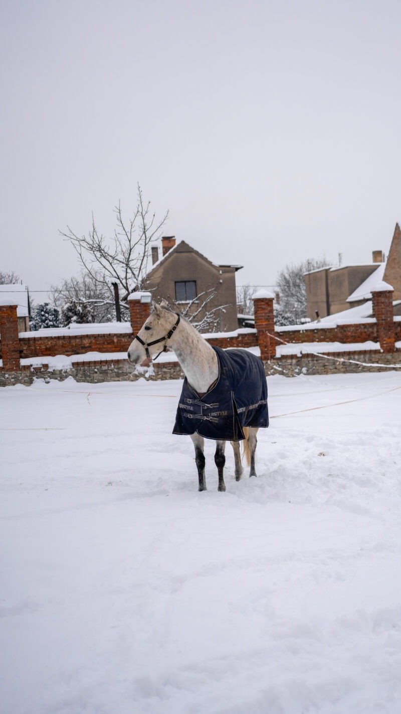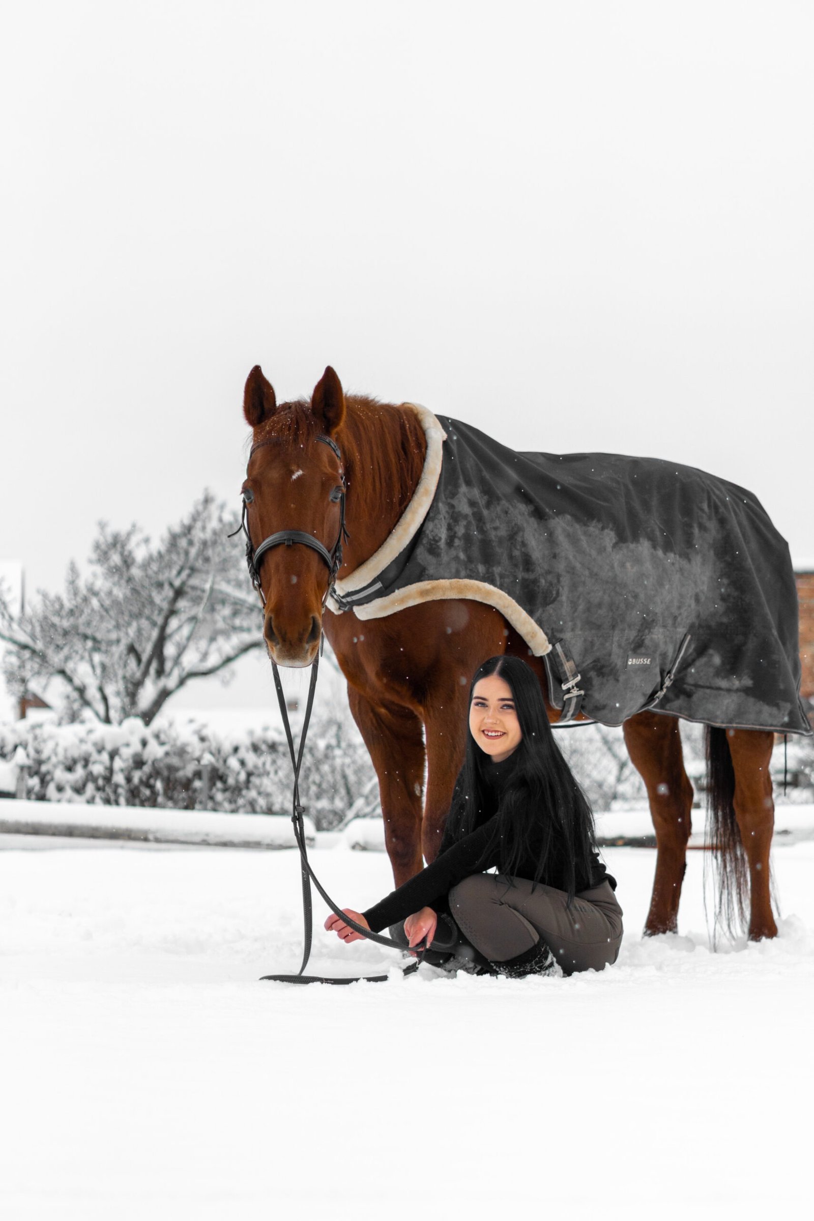 Zimní focení modelky ve společnosti koní