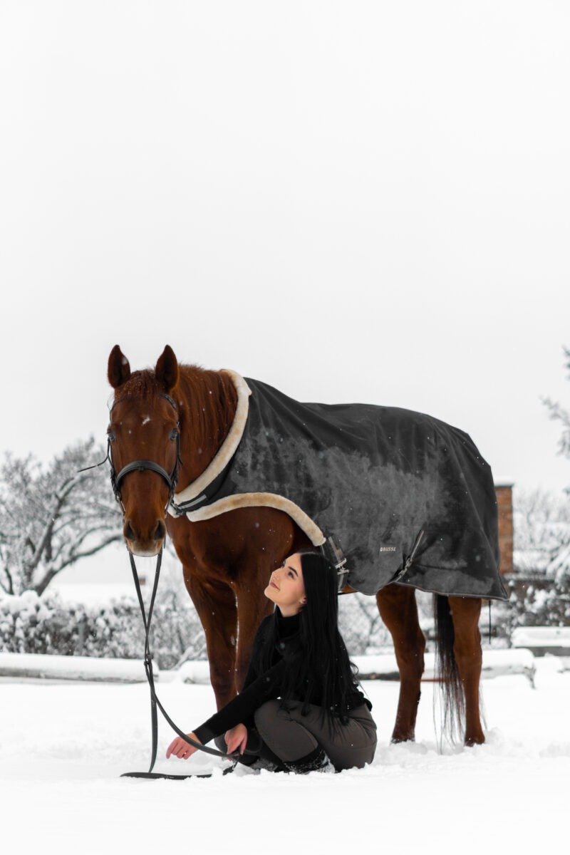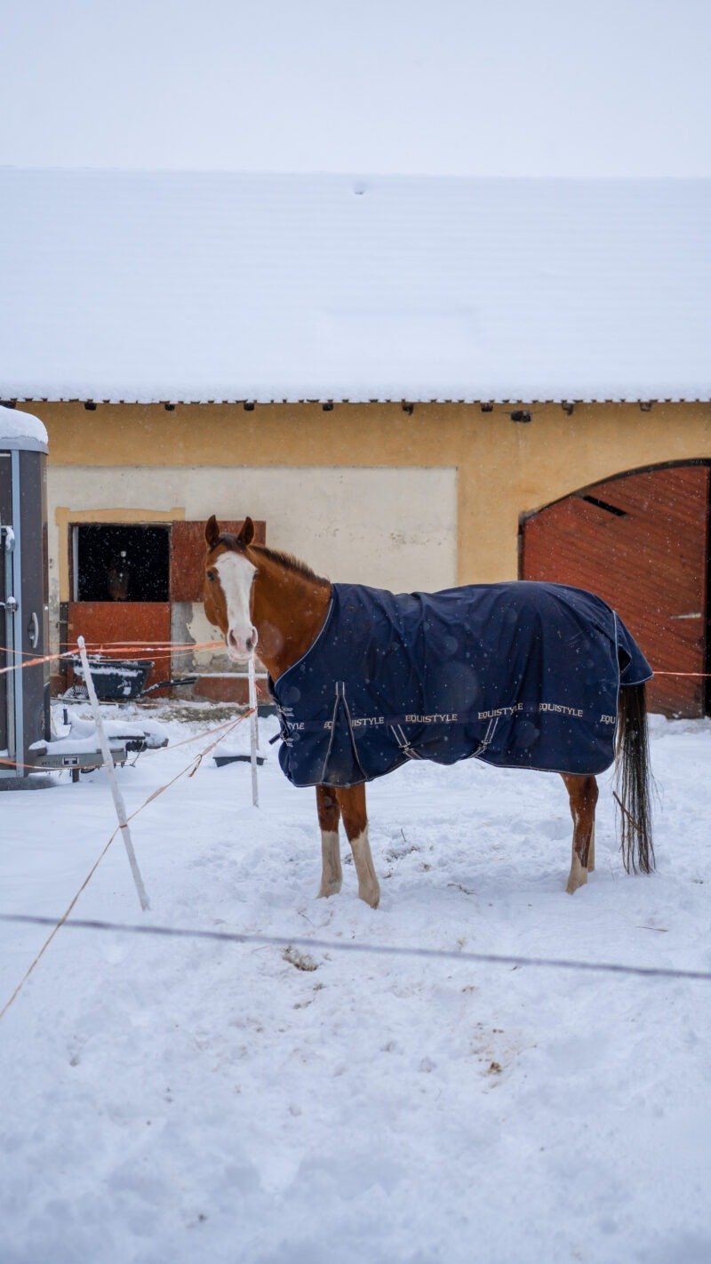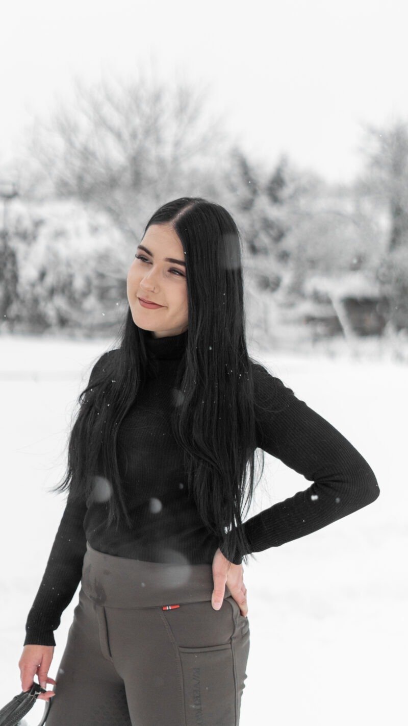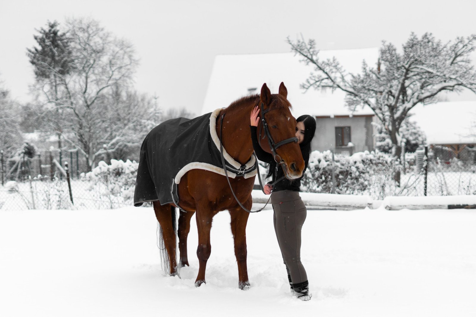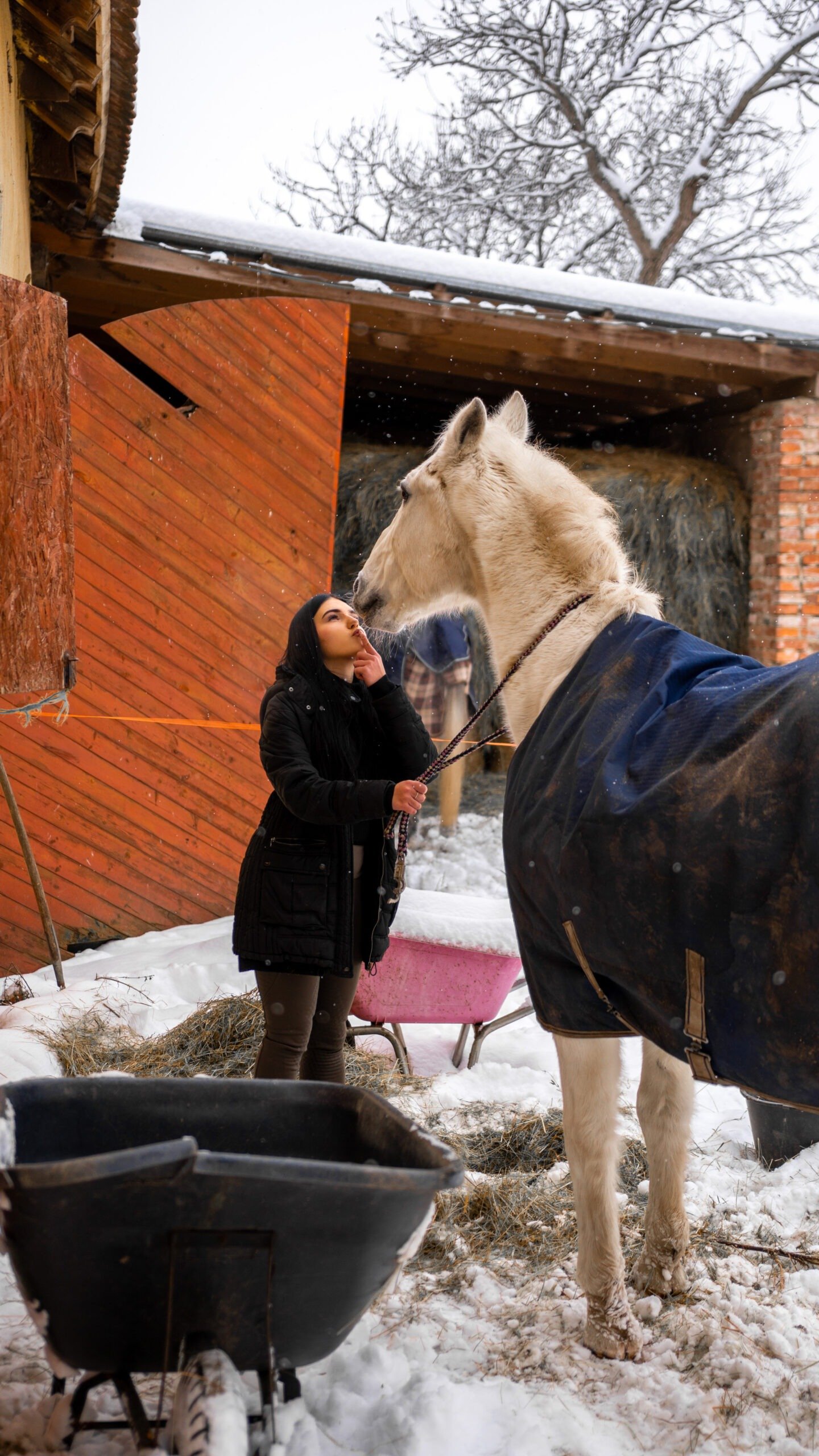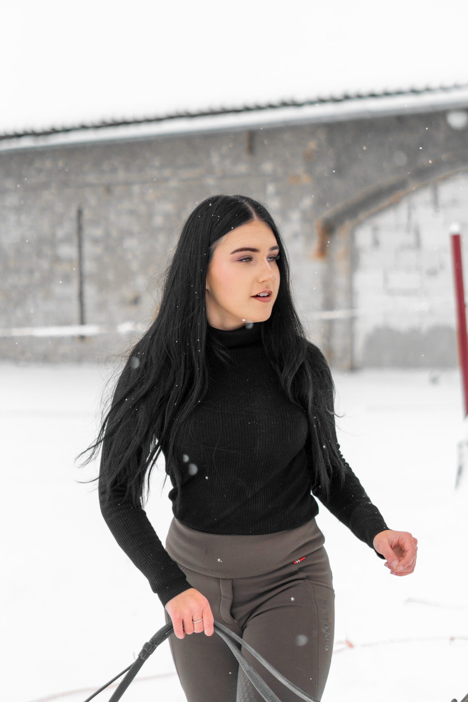 Zimní focení modelky ve společnosti koní