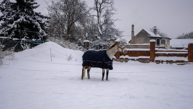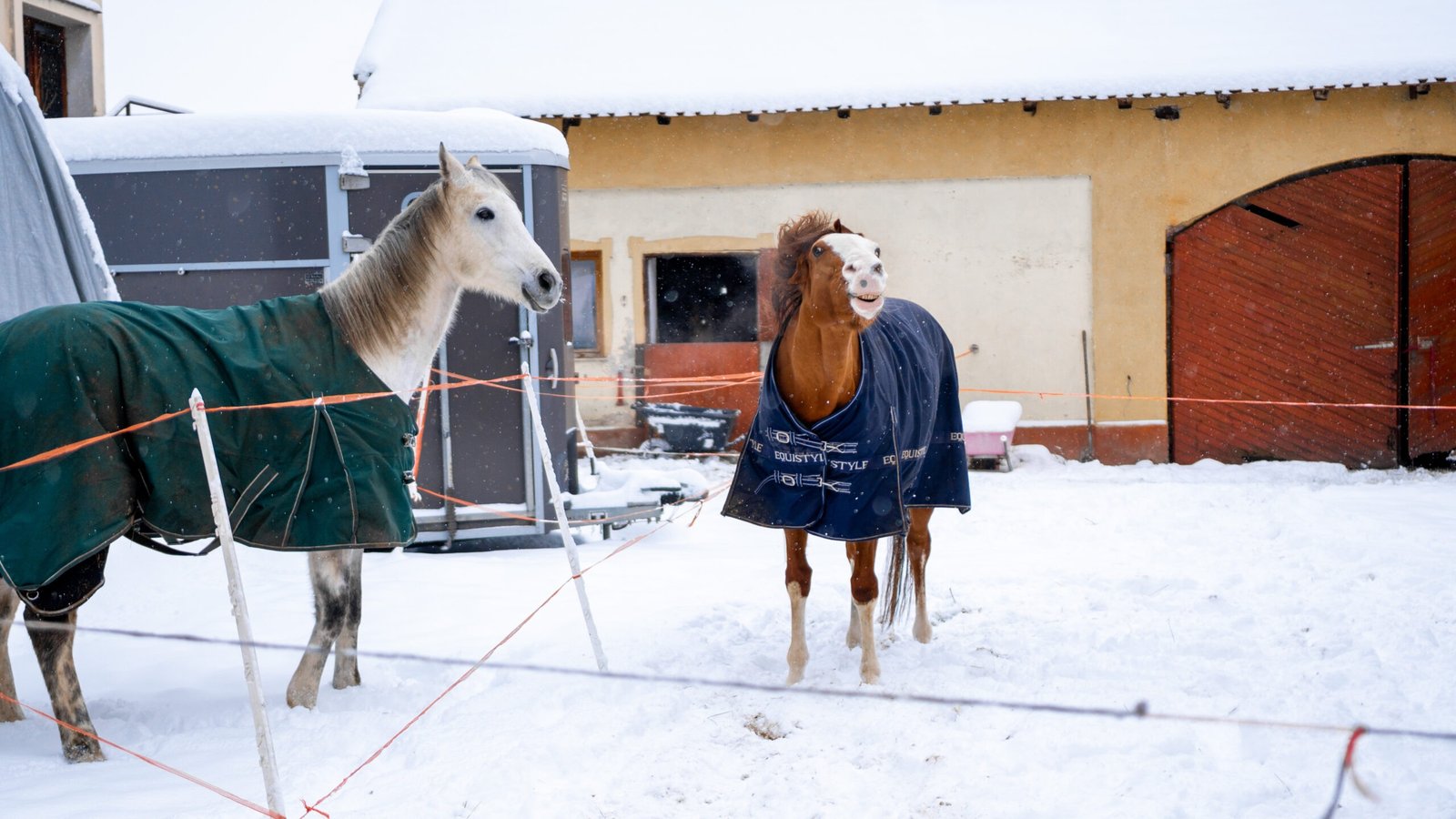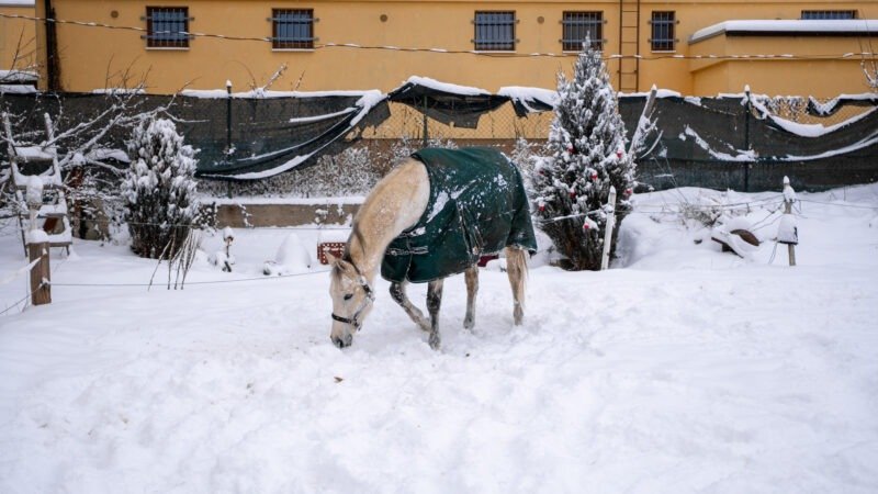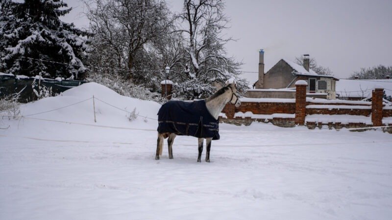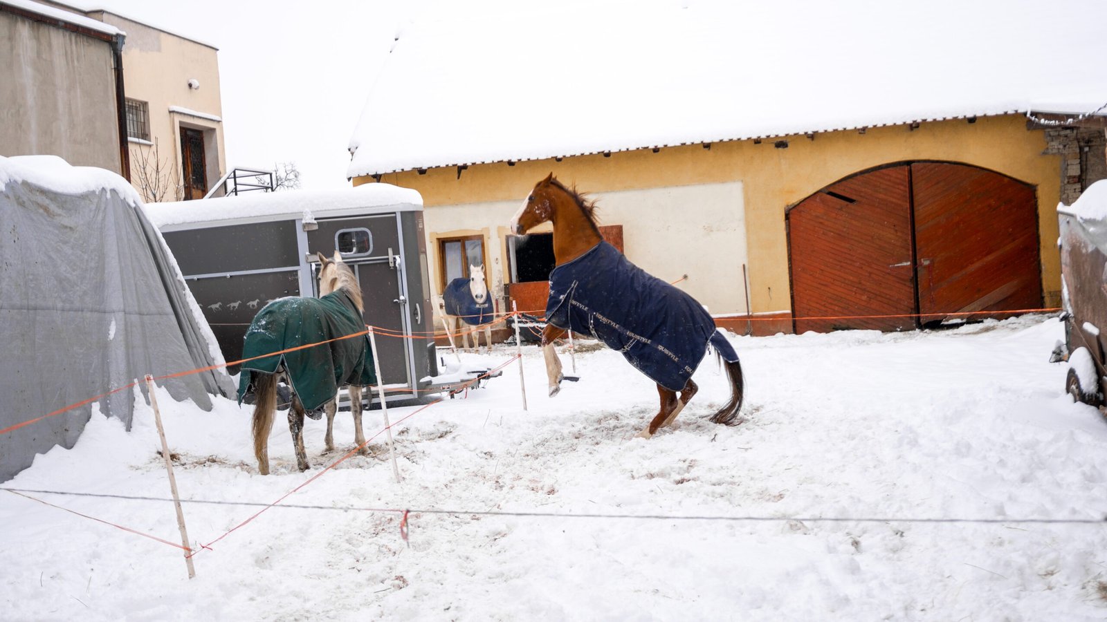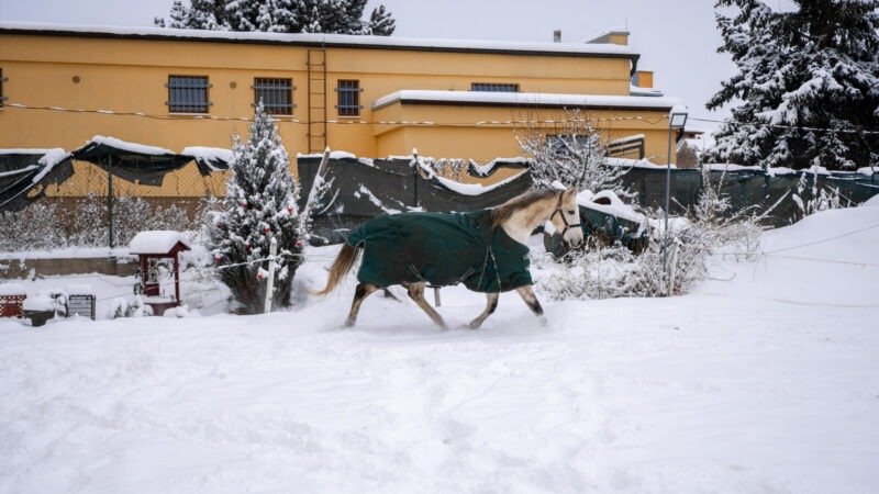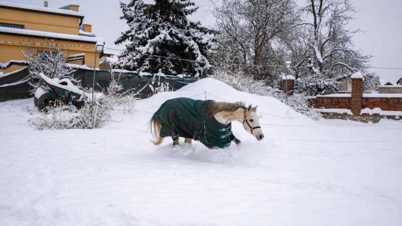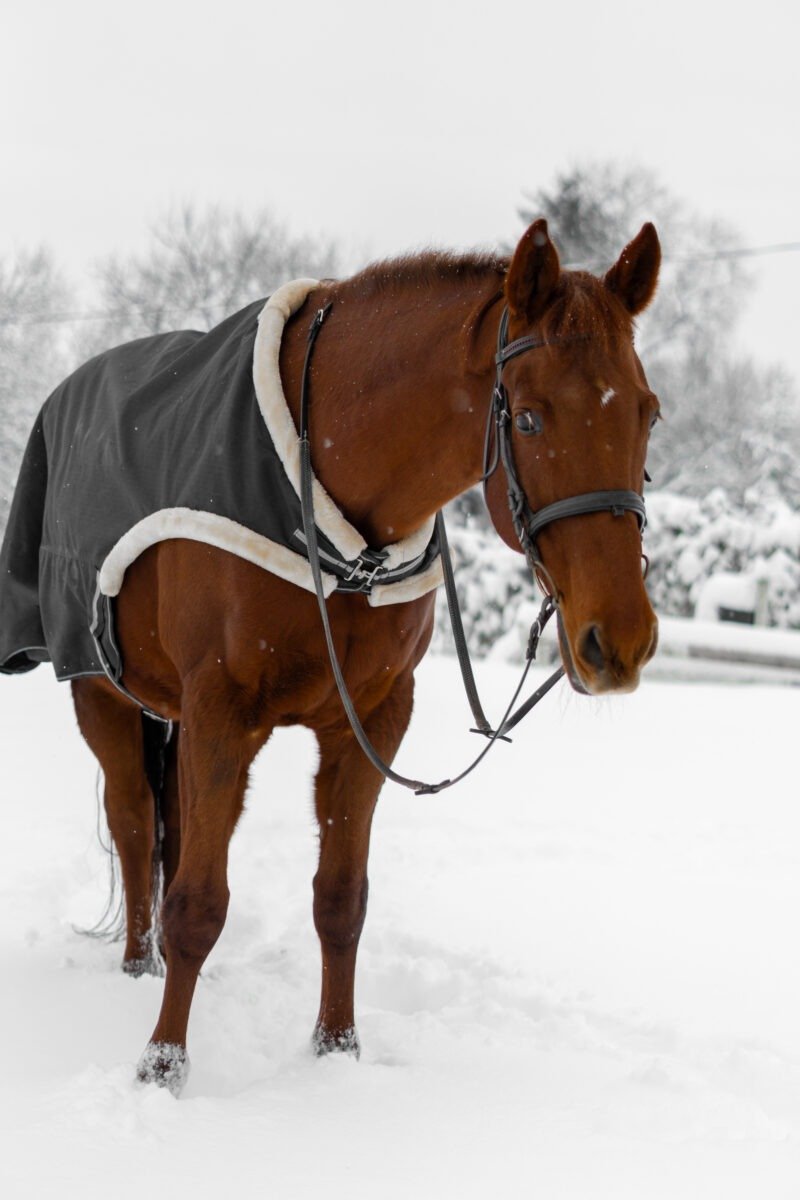Zimní focení modelky ve společnosti koní