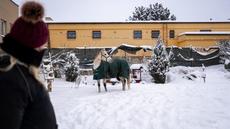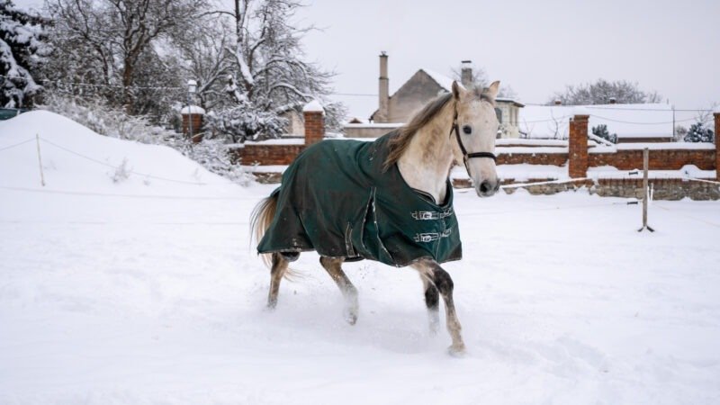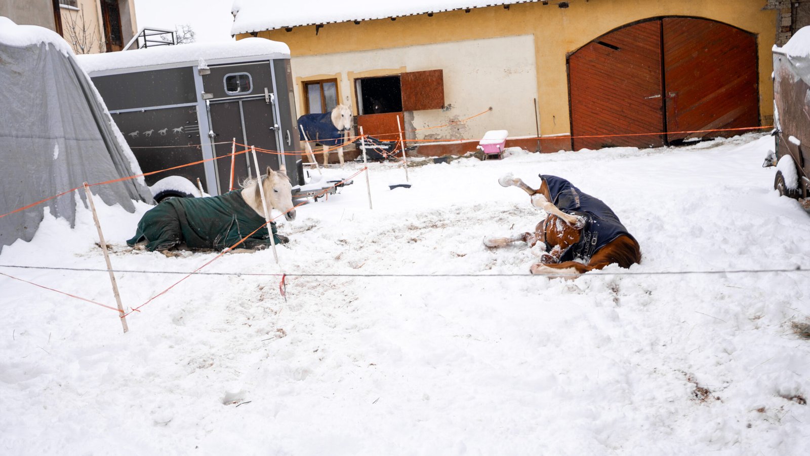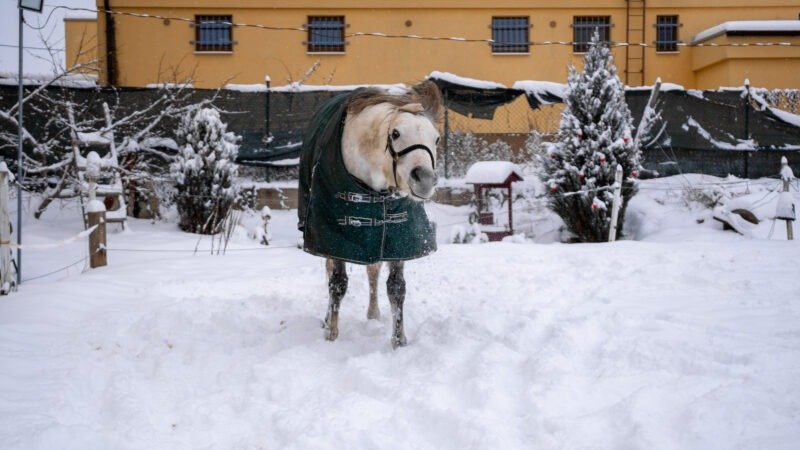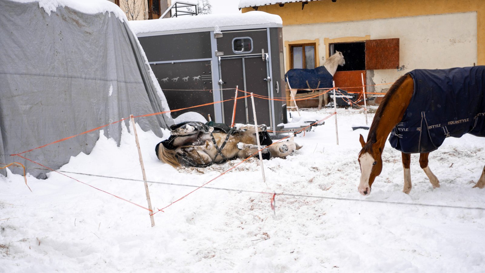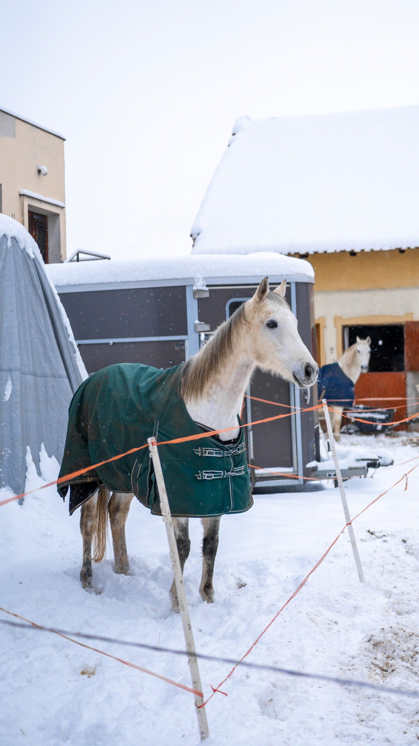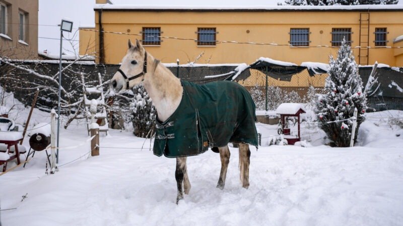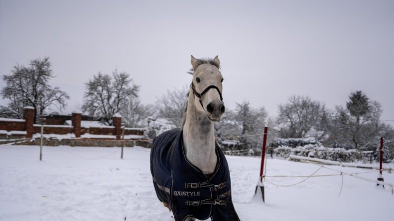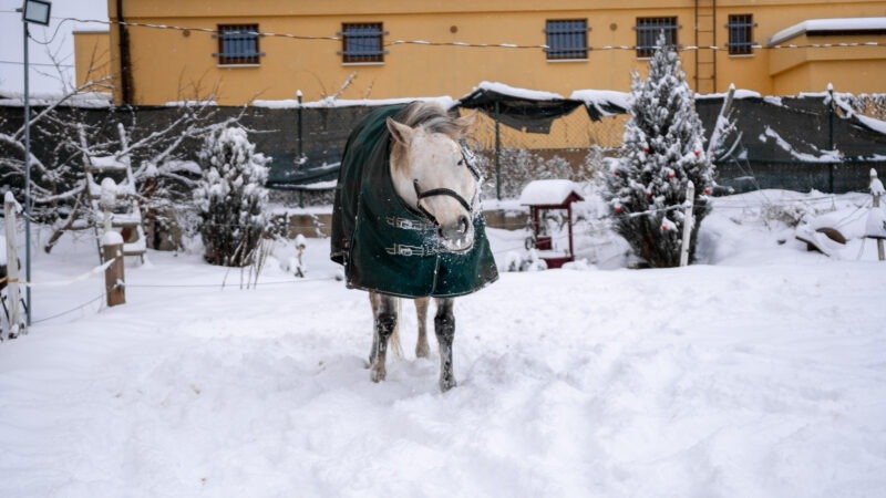 Zimní focení modelky ve společnosti koní